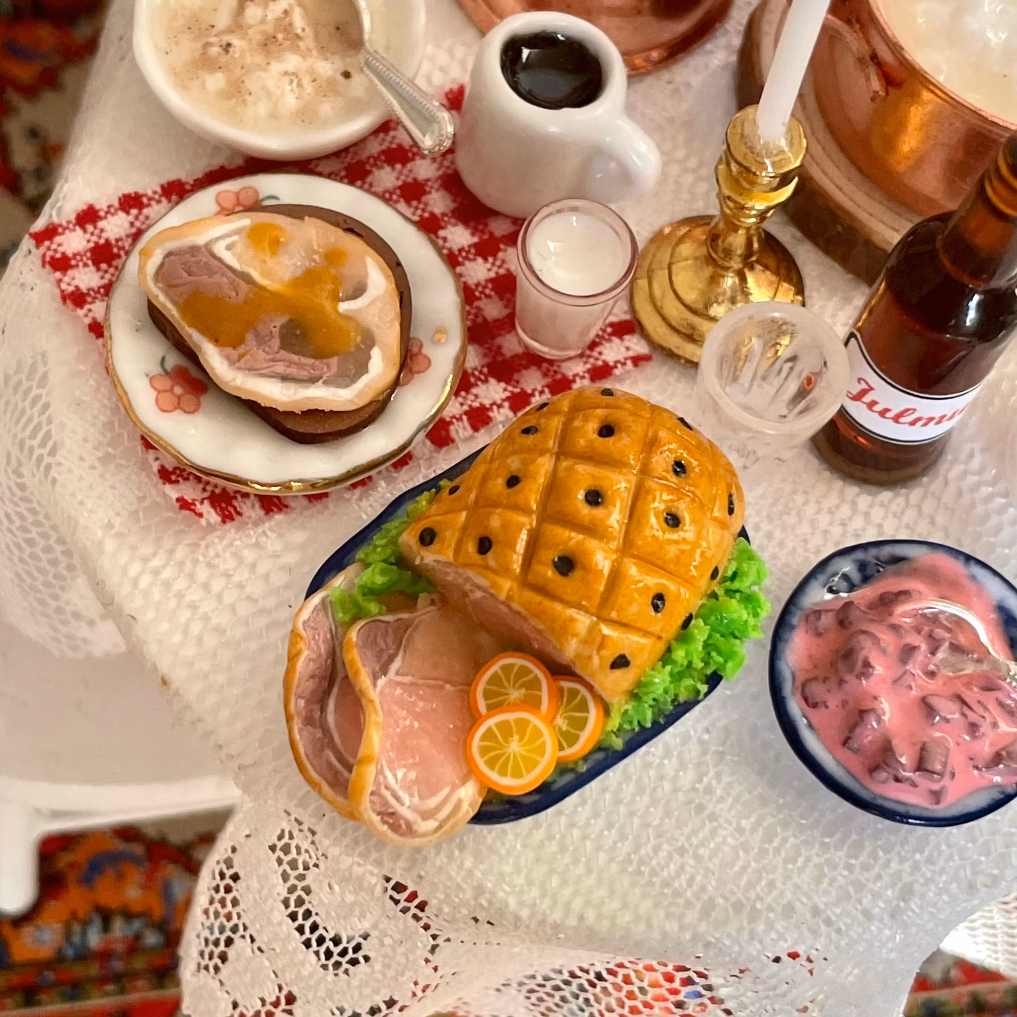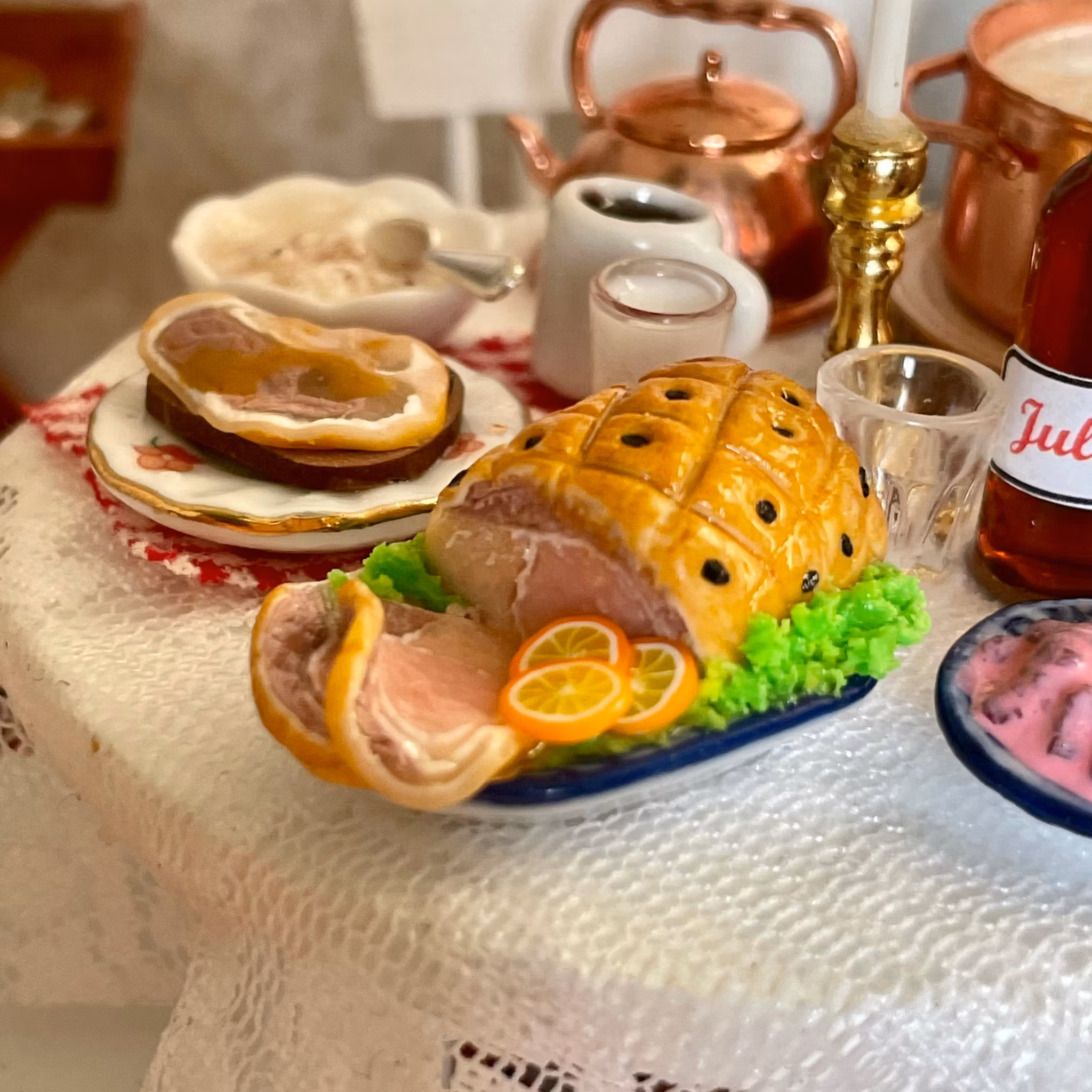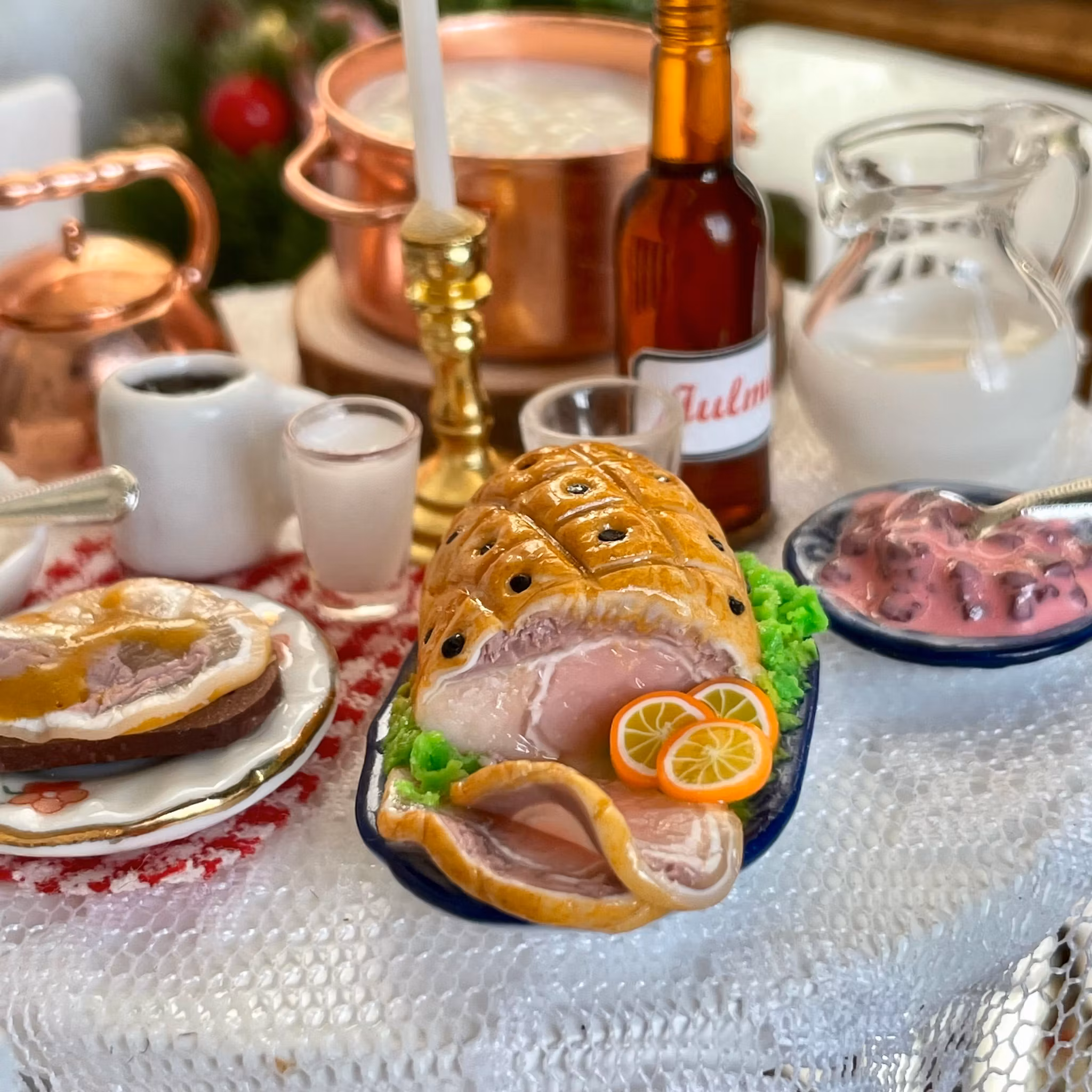 Äntligen är årets upplaga här! Festlig julskinka i miniatyr, på sött porslinsfat med läckra apelsinskivor. Nejlikor och svål gör skinkan mycket verklighetstrogen. Handgjord och mycket välarbetad. Porslinsfatet mäter ca 30*20 mm och passar så väl till dockskåp i skala 1:12, Lundbyskåp som till Nisse.