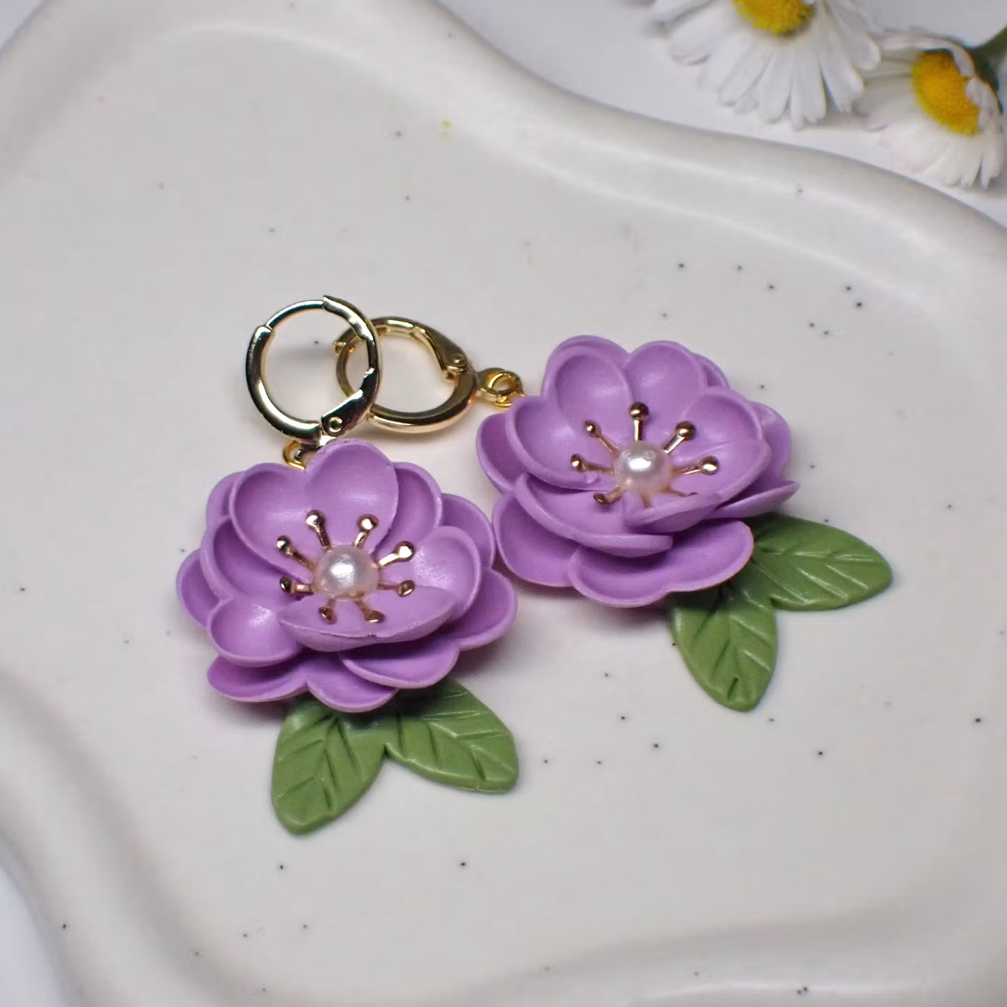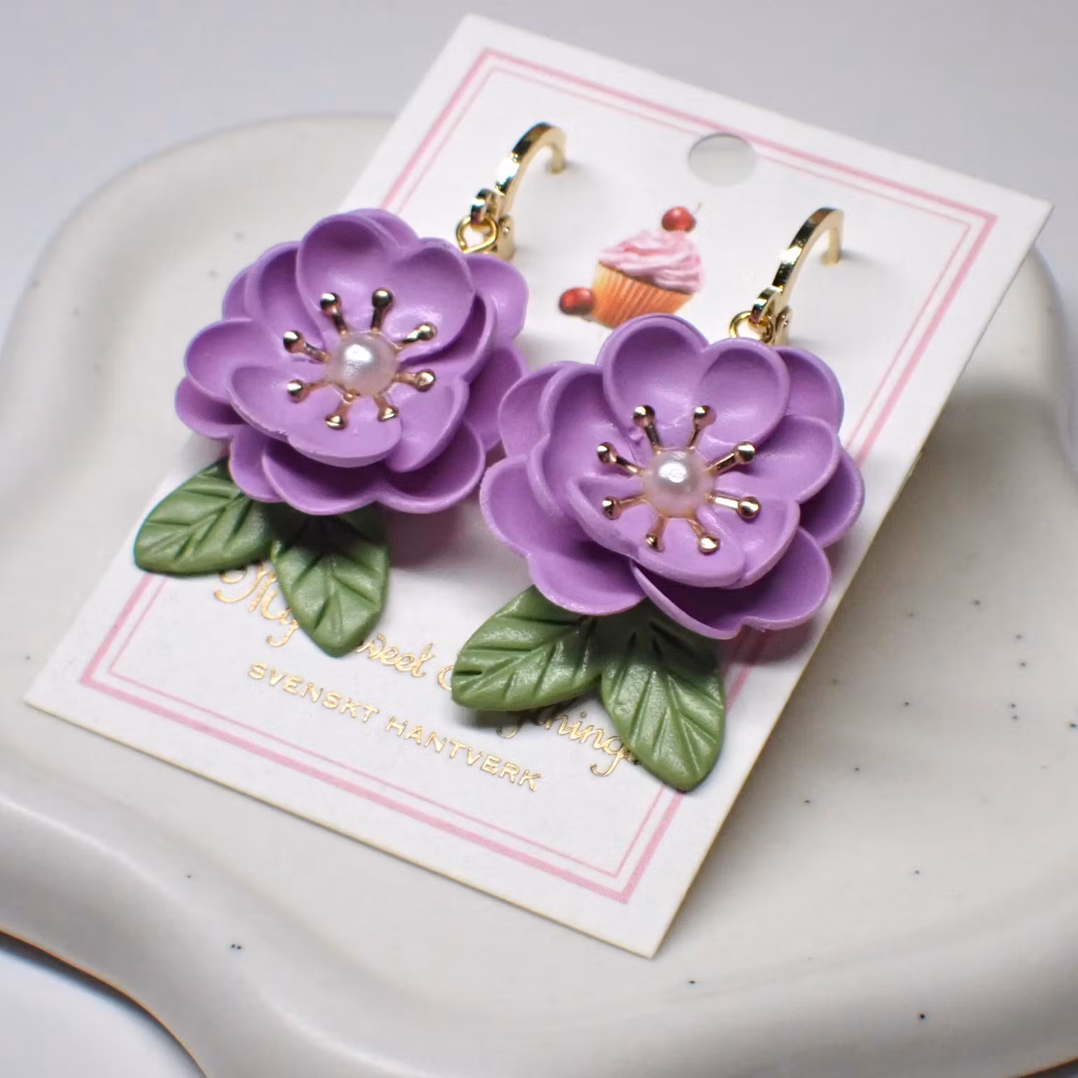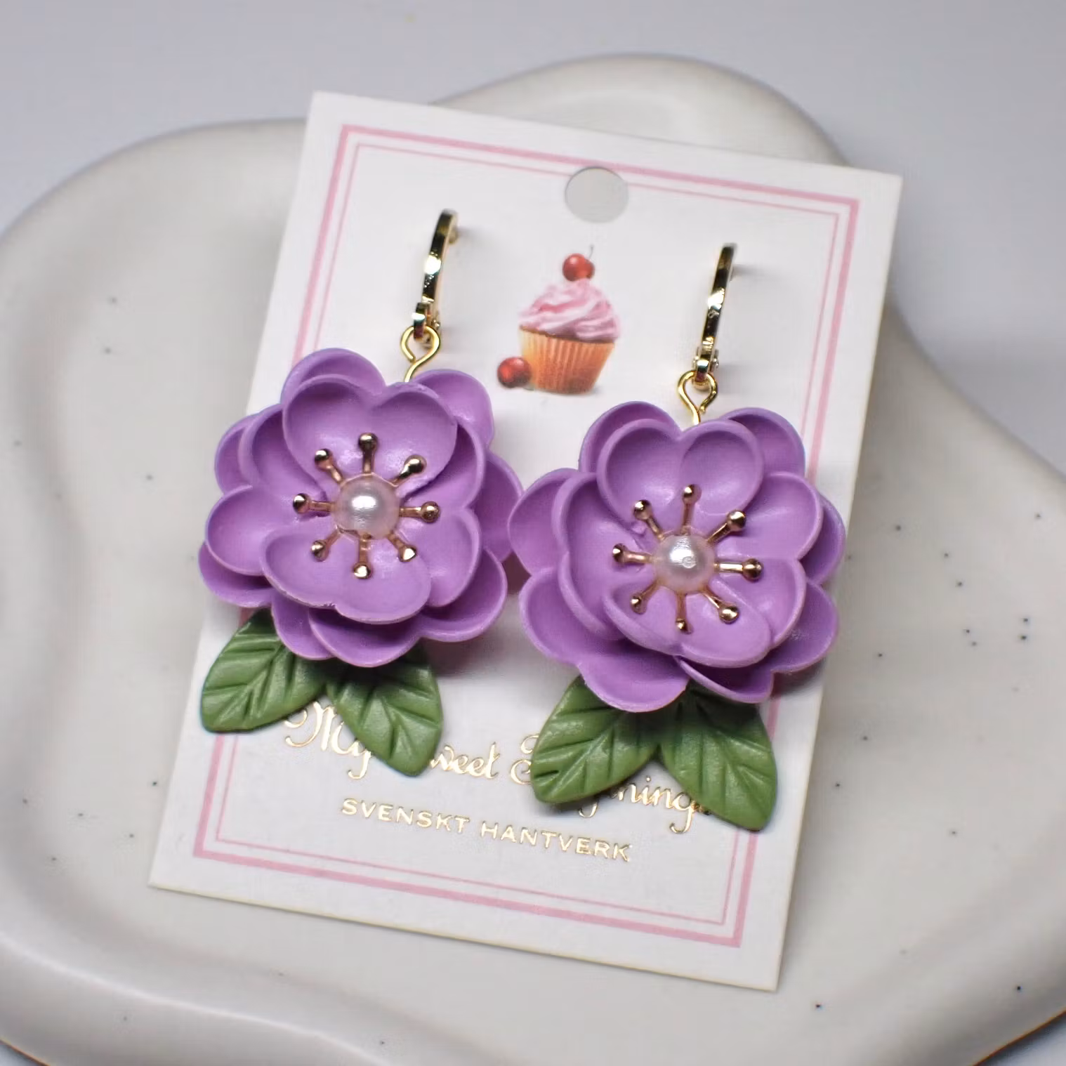 Vackra magnolior i lila med silver- eller guldpläterade brisyrkrokar och söta detaljer. Nickelsäkra och fjäderlätta.