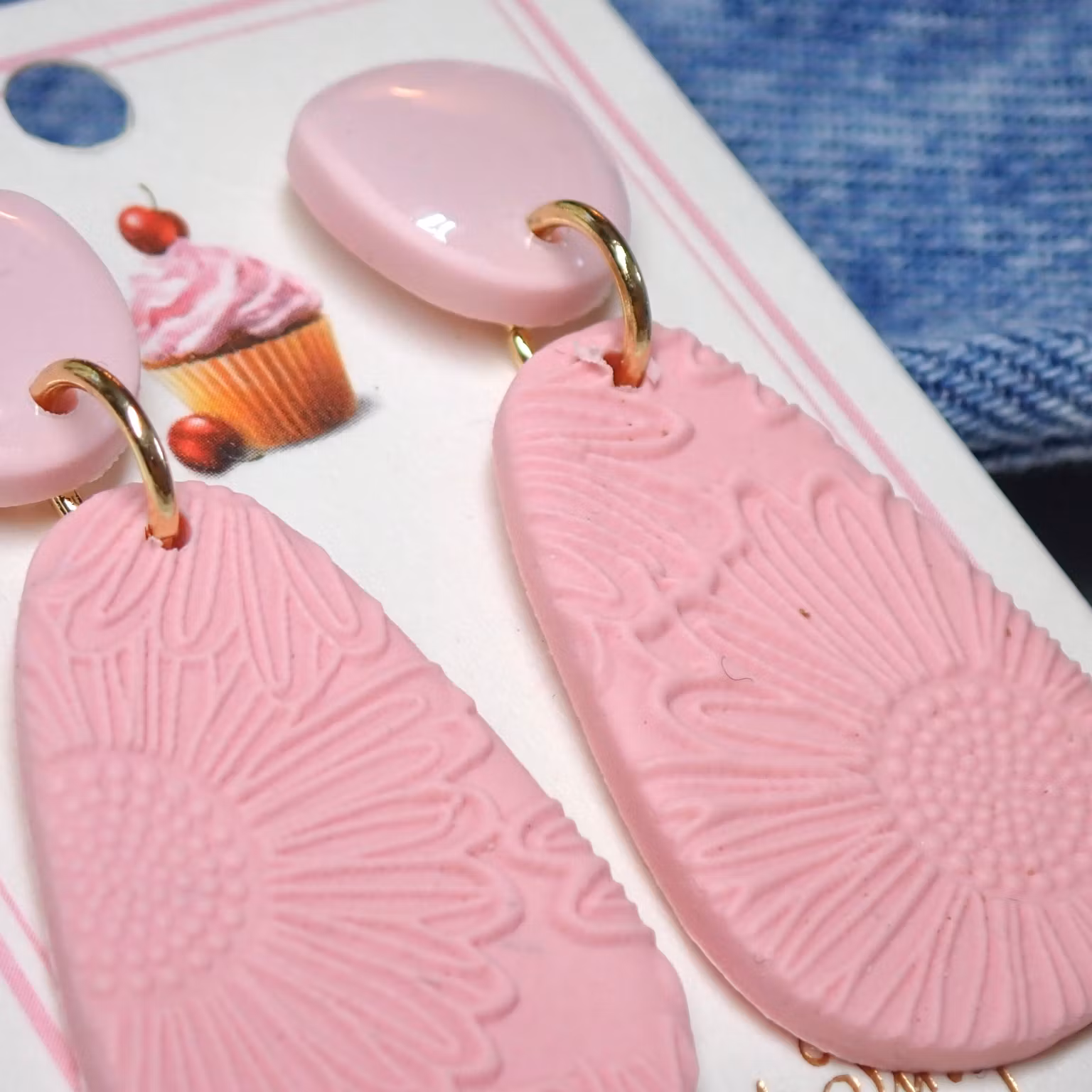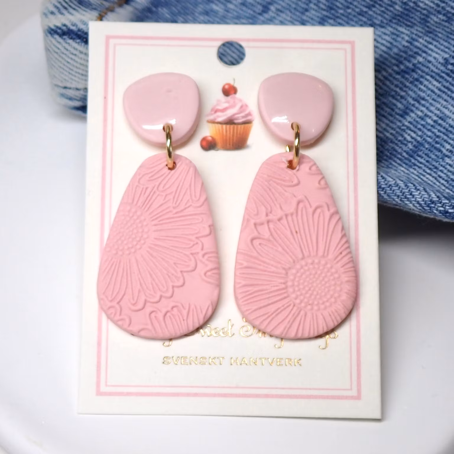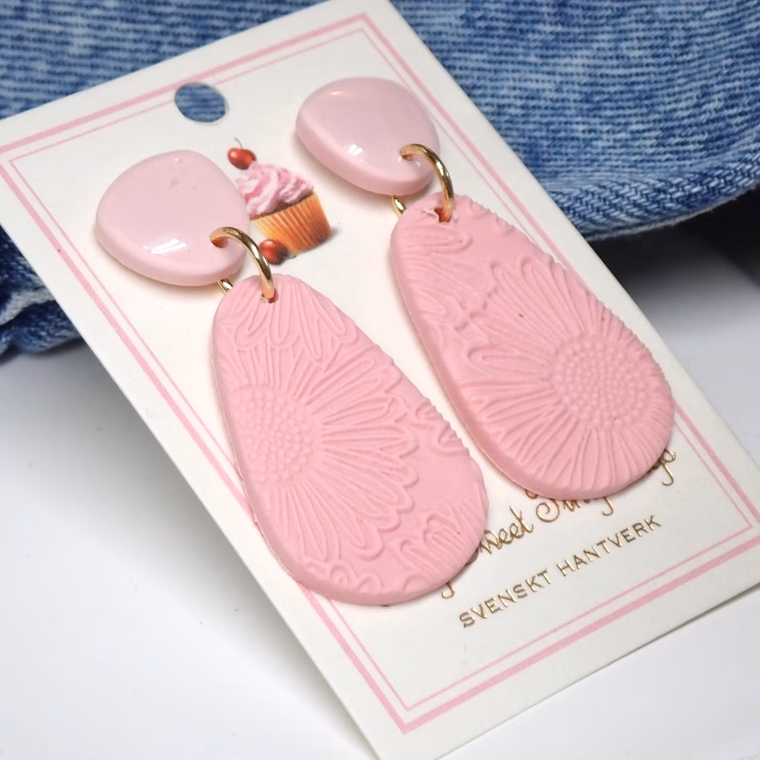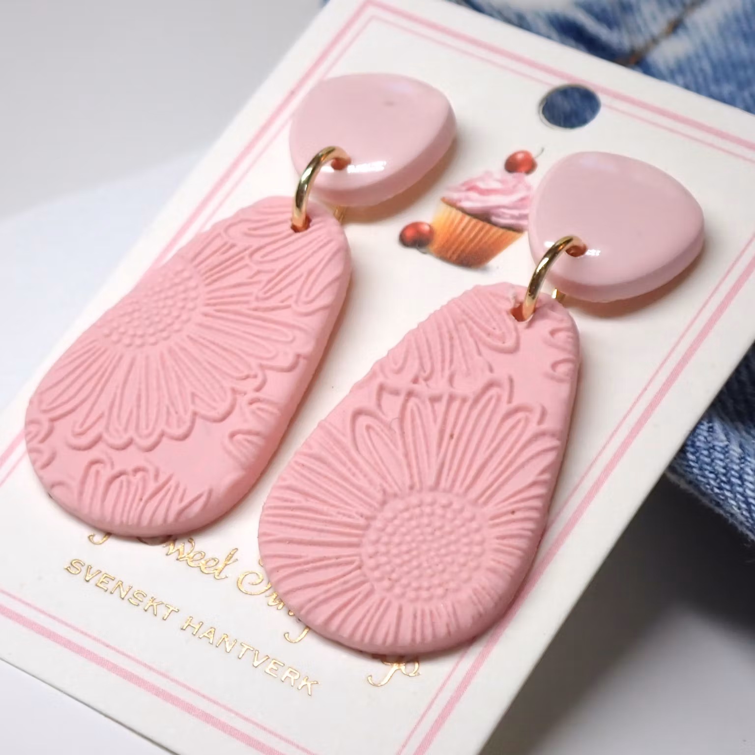 Supersnygga örhängen i en ljusrosa ton med vackert solrosmönster. Handgjorda och fjäderlätta med nickelsäkra stift på baksidan. För snygga för att inte ha i smyckesskrinet!