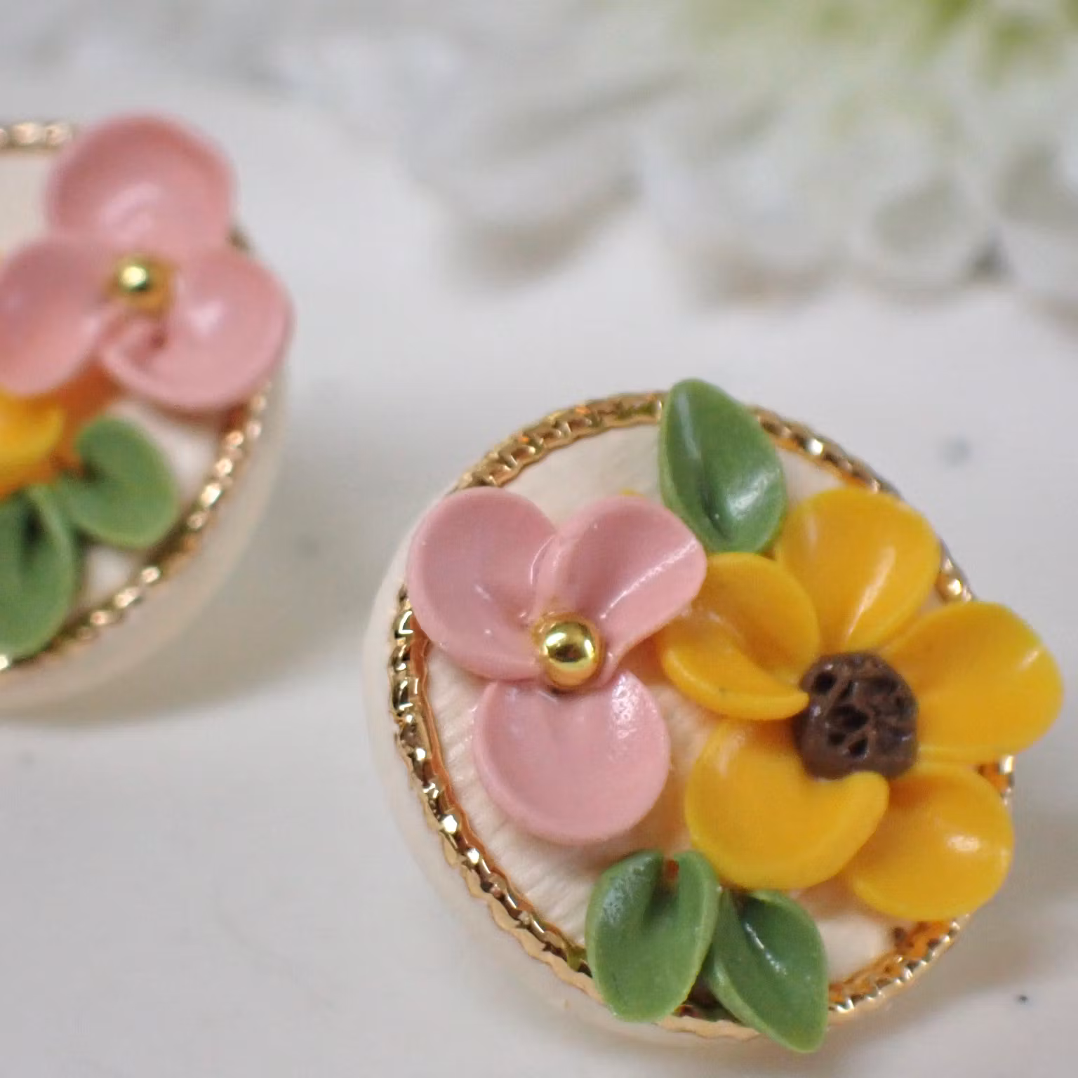 Sötaste örhängena med handskulpterade blommor i rosa och gult. Fjäderlätta och hållbara örhängen i begränsad upplaga. Så vackra till sommaren!