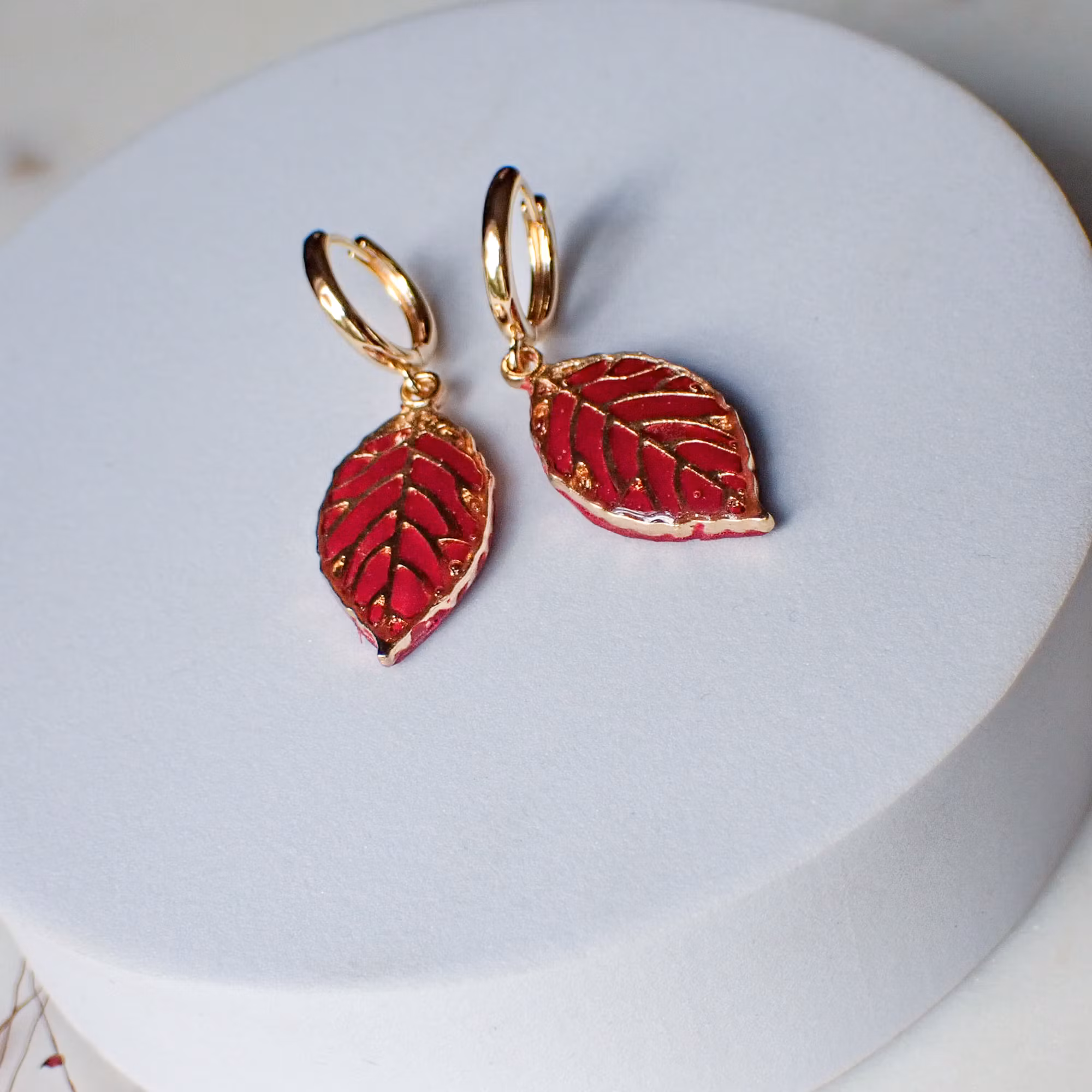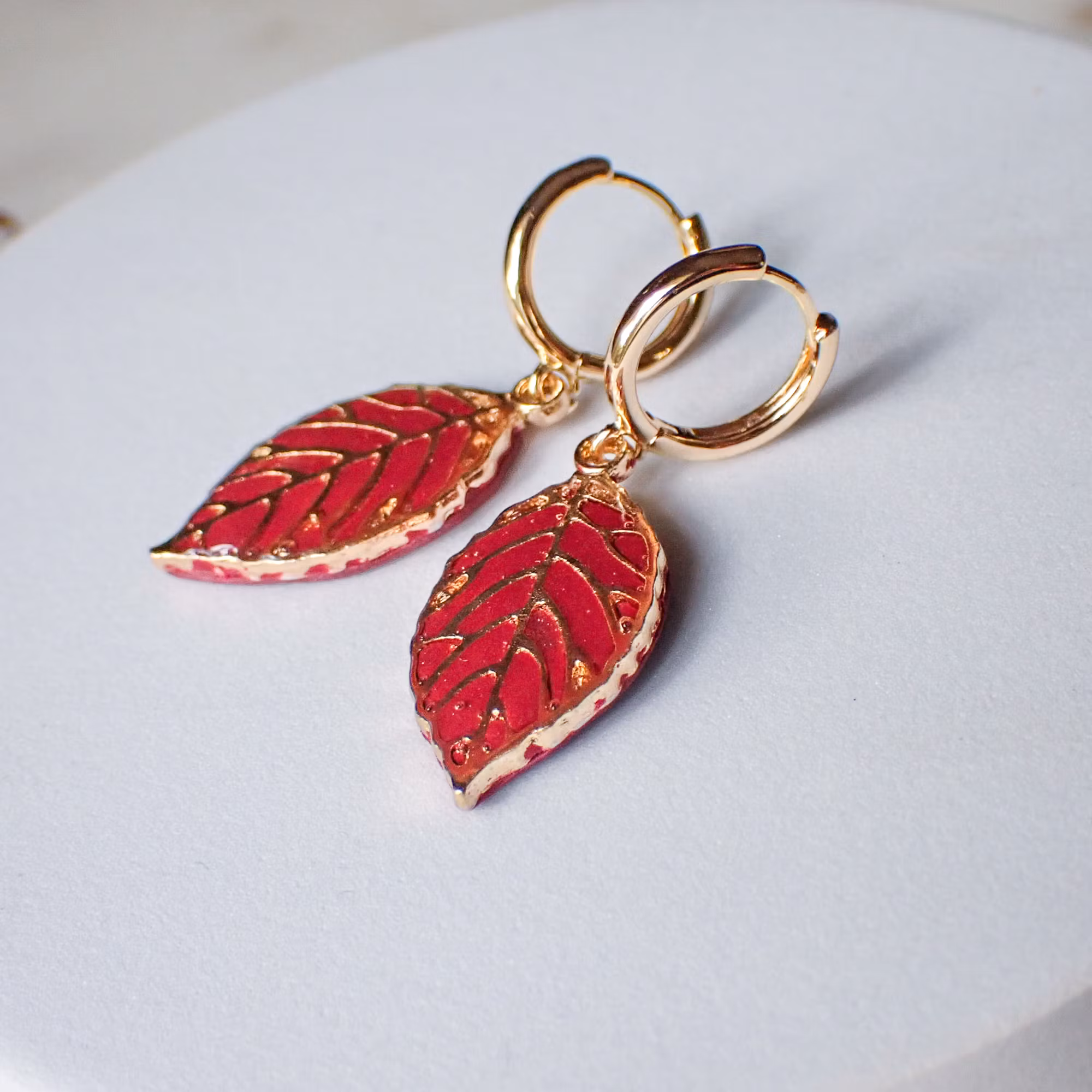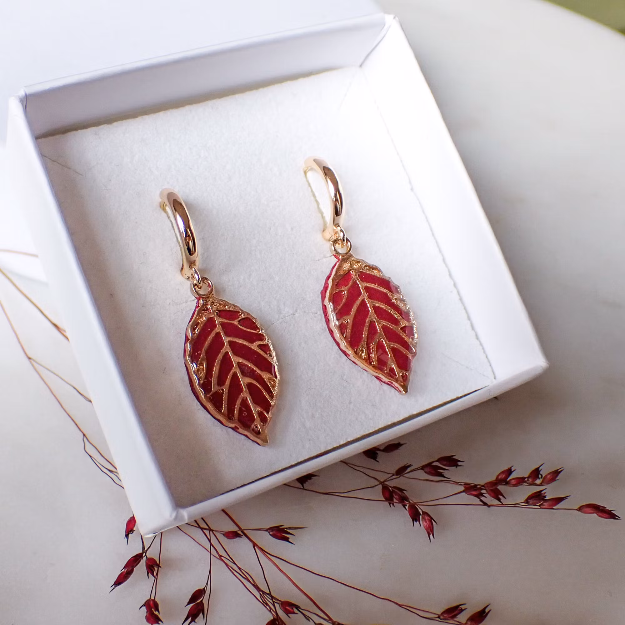 Små blad med skimrande finish mot plommonfärgad bakgrund. En vacker kombination av metalliskt sken och varma hösttoner. Fina, handgjorda örhängen att bära både till vardag och till festligare tillfällen.