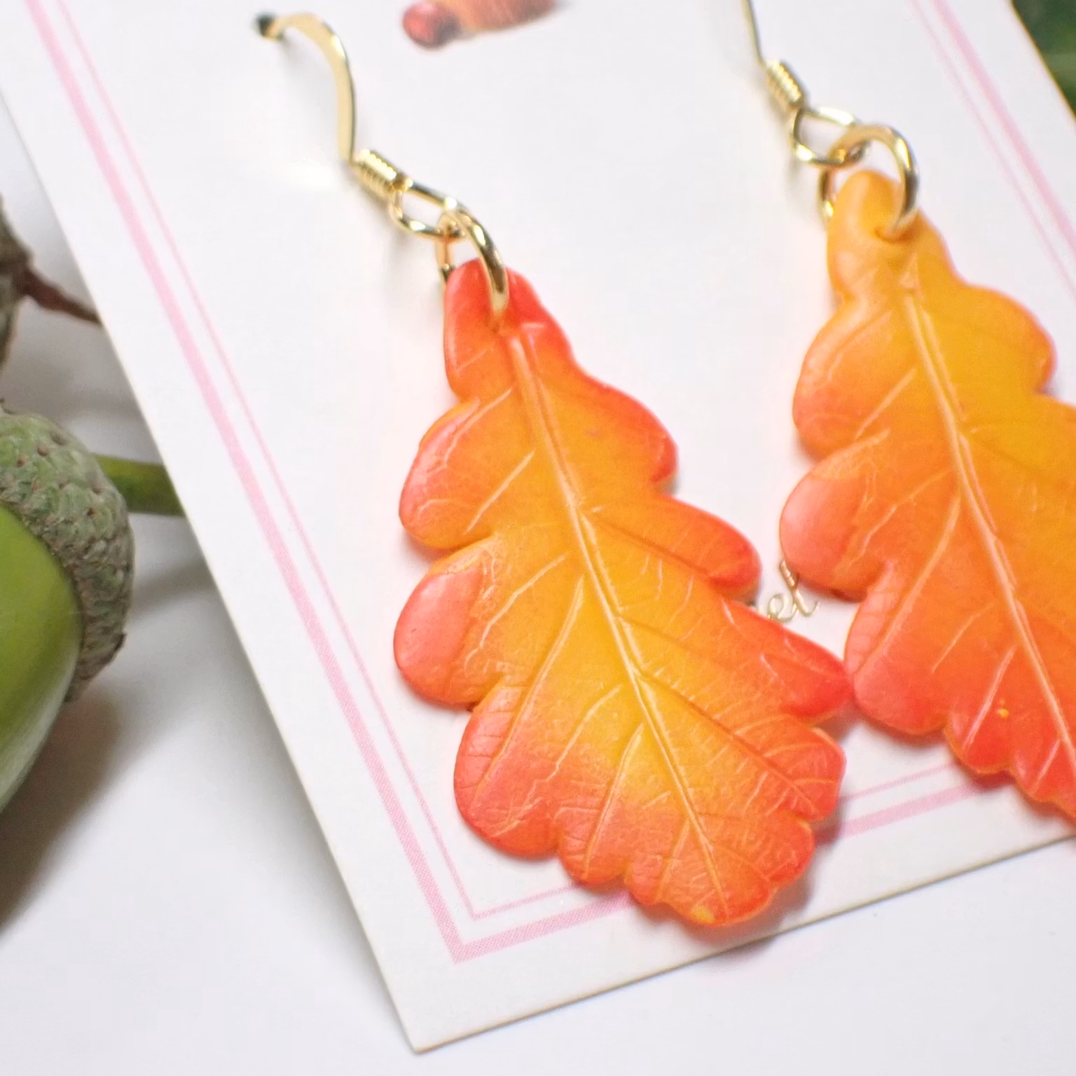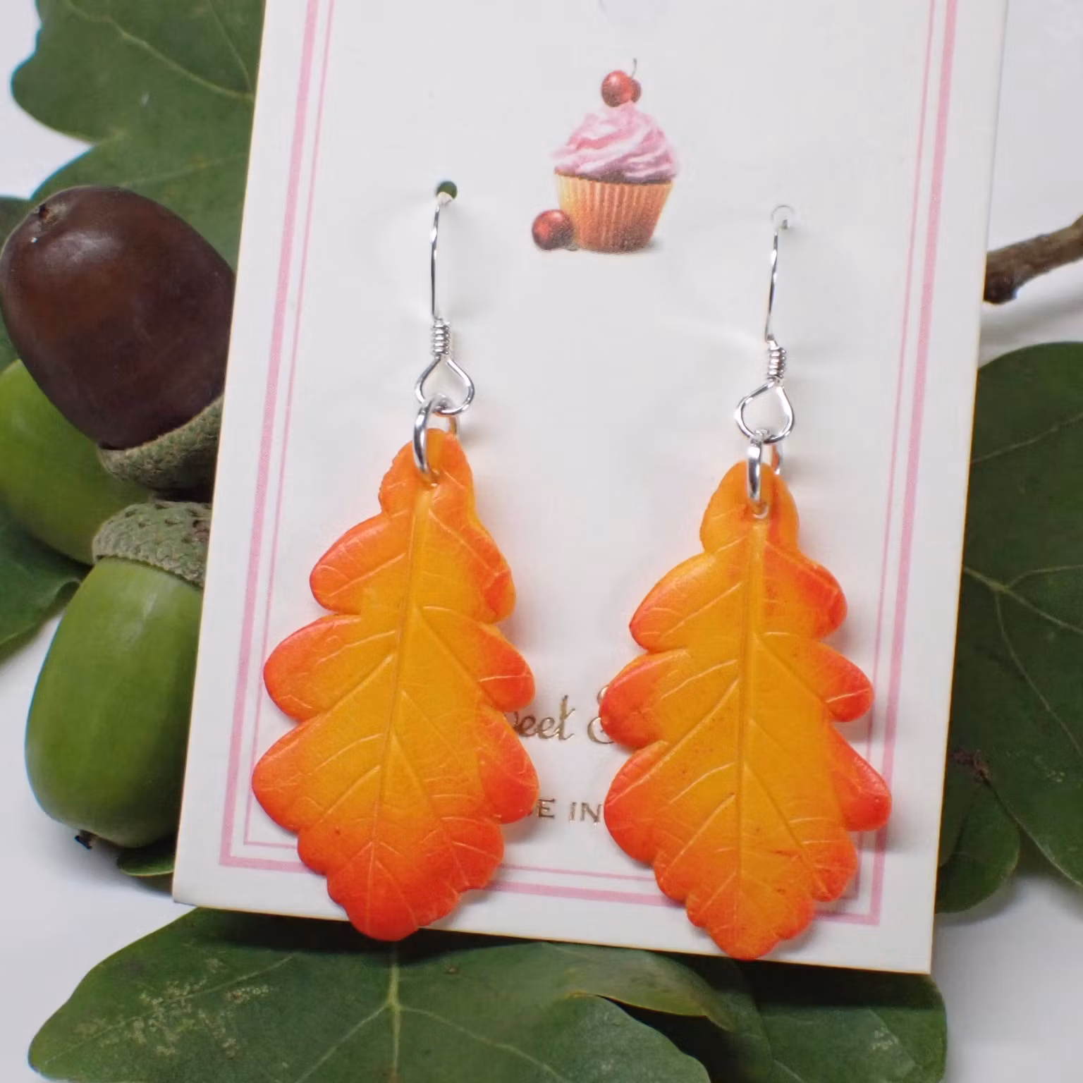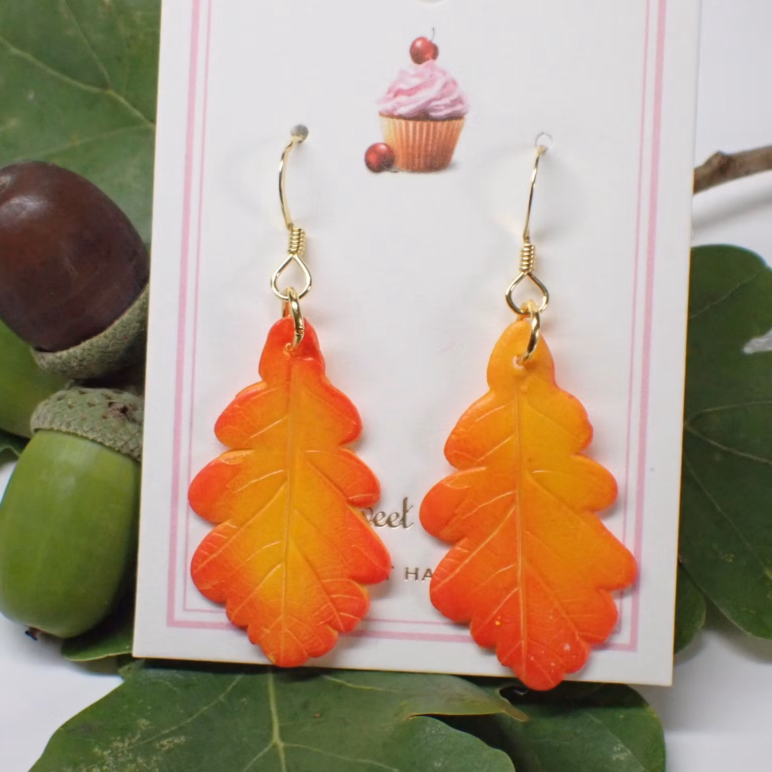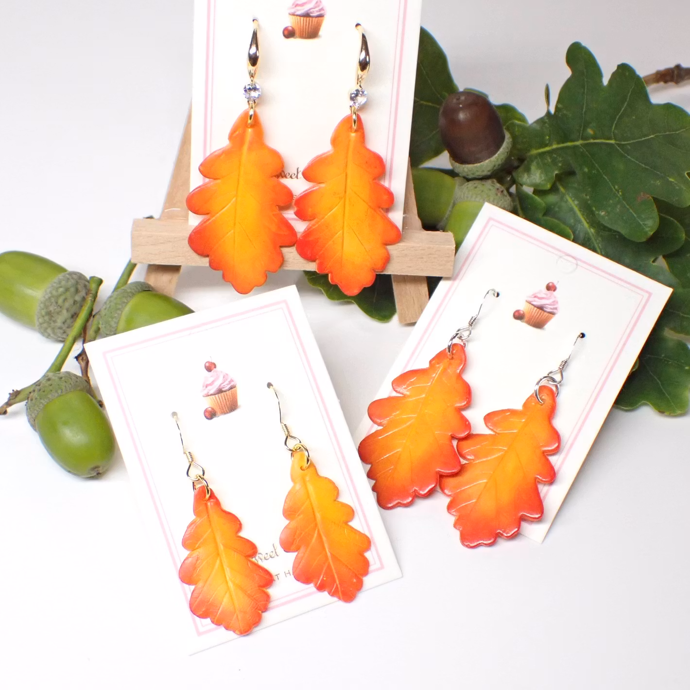 Vackra höstörhängen med eklöv som mäter cirka 28 mm på längden. Du kan välja mellan öronkrokar i sterlingsilver eller med 18 karat guldplätering. Eklöven är fjäderlätta och väger under ett gram styck. Eklöven finns även i en större design som mäter 42 mm.