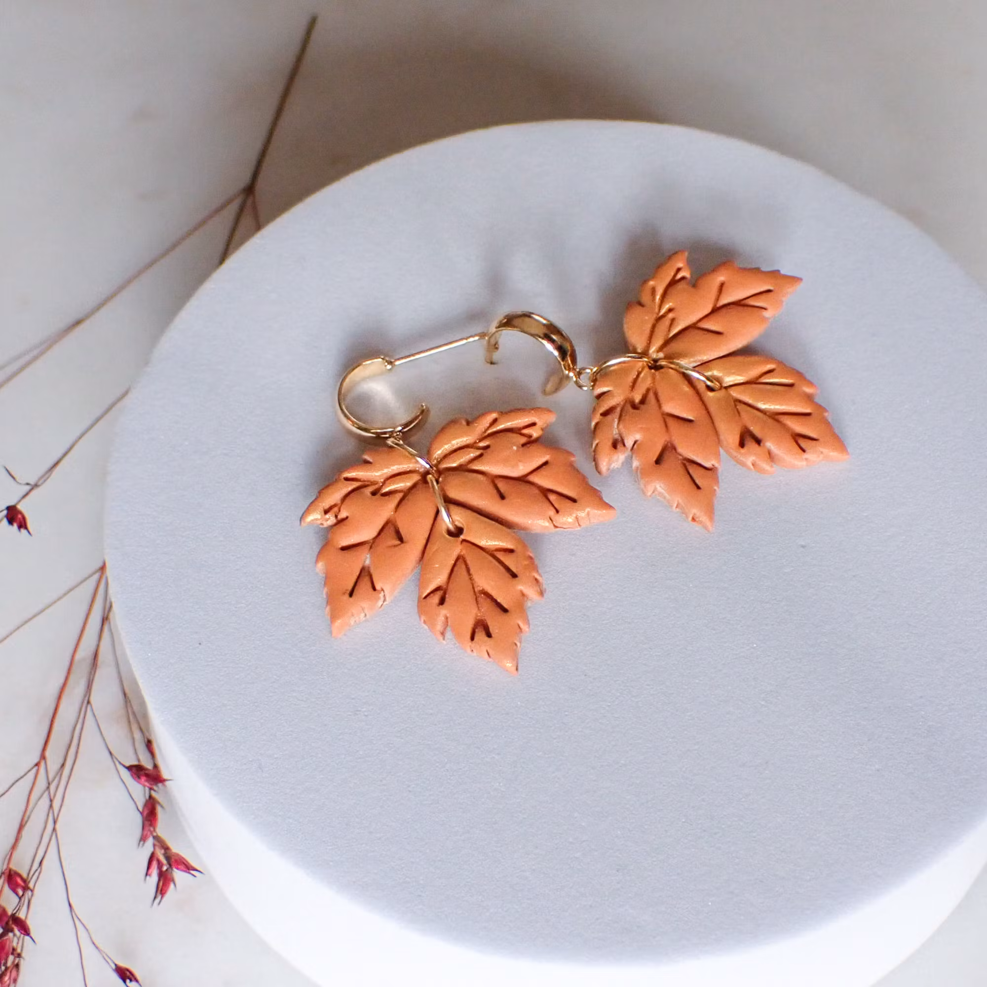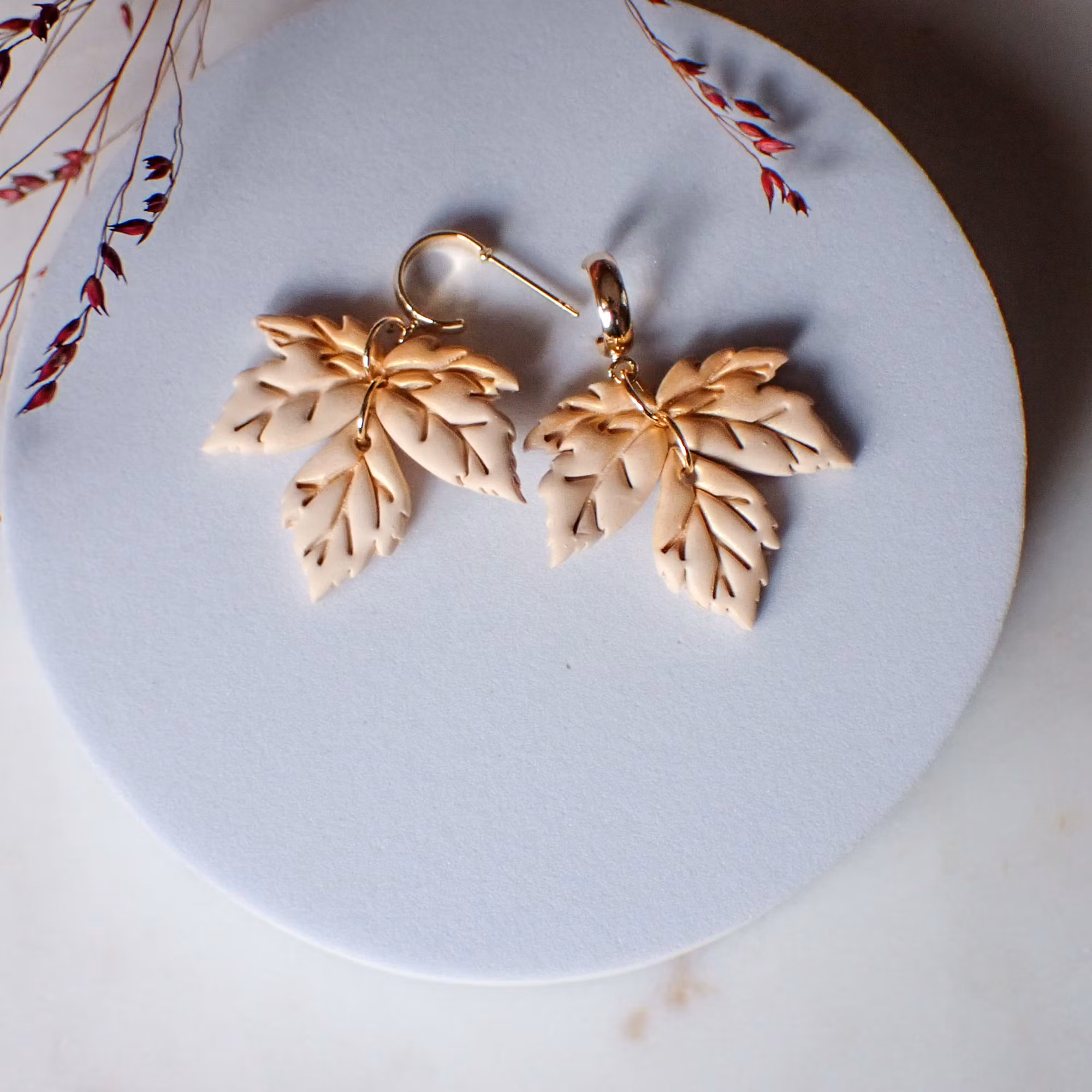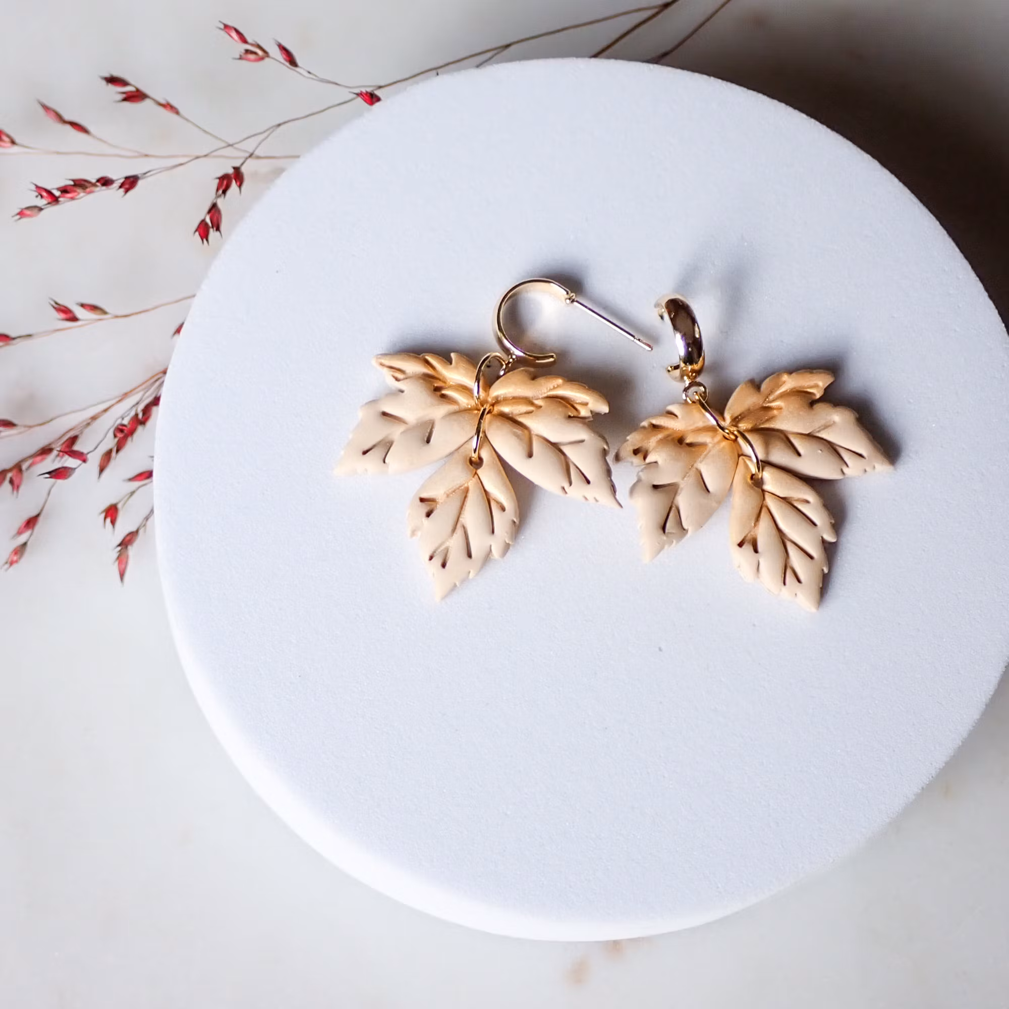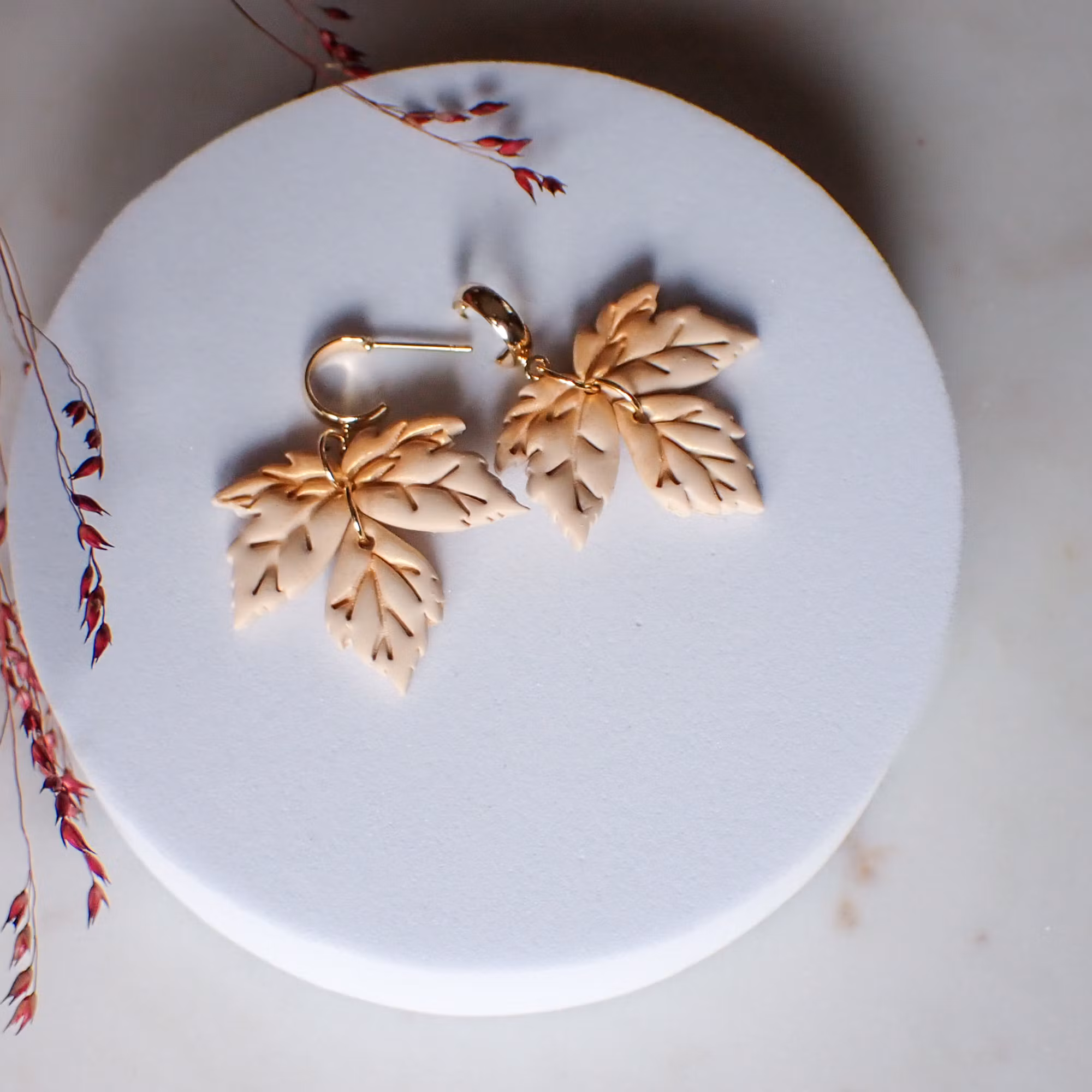 Tvådelade lövörhängen med mjuka former och guldiga nyanser. Skulpterade i polymerlera med lätt struktur som fångar ljuset fint. Lätta att bära och passar lika bra till vardag som till fest.