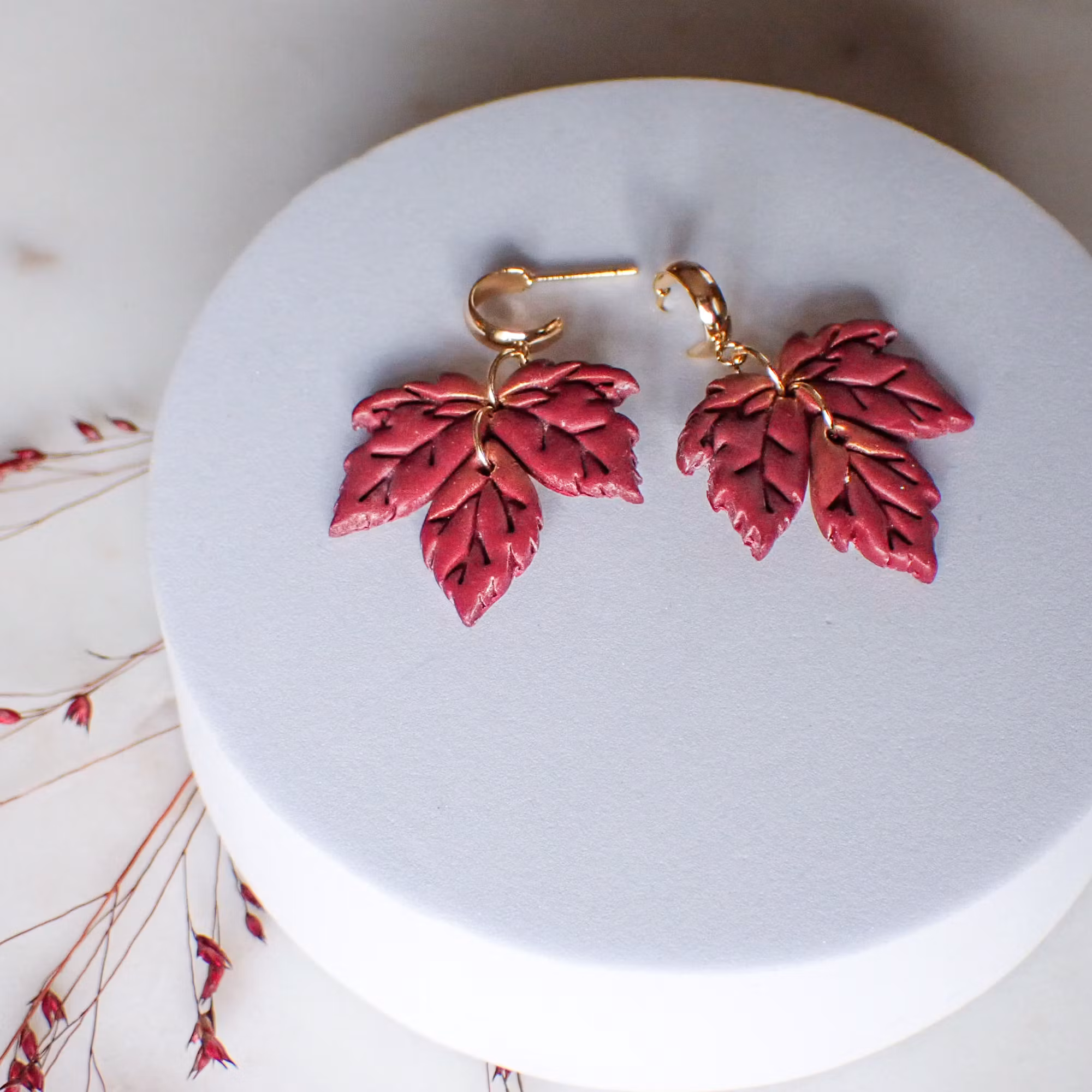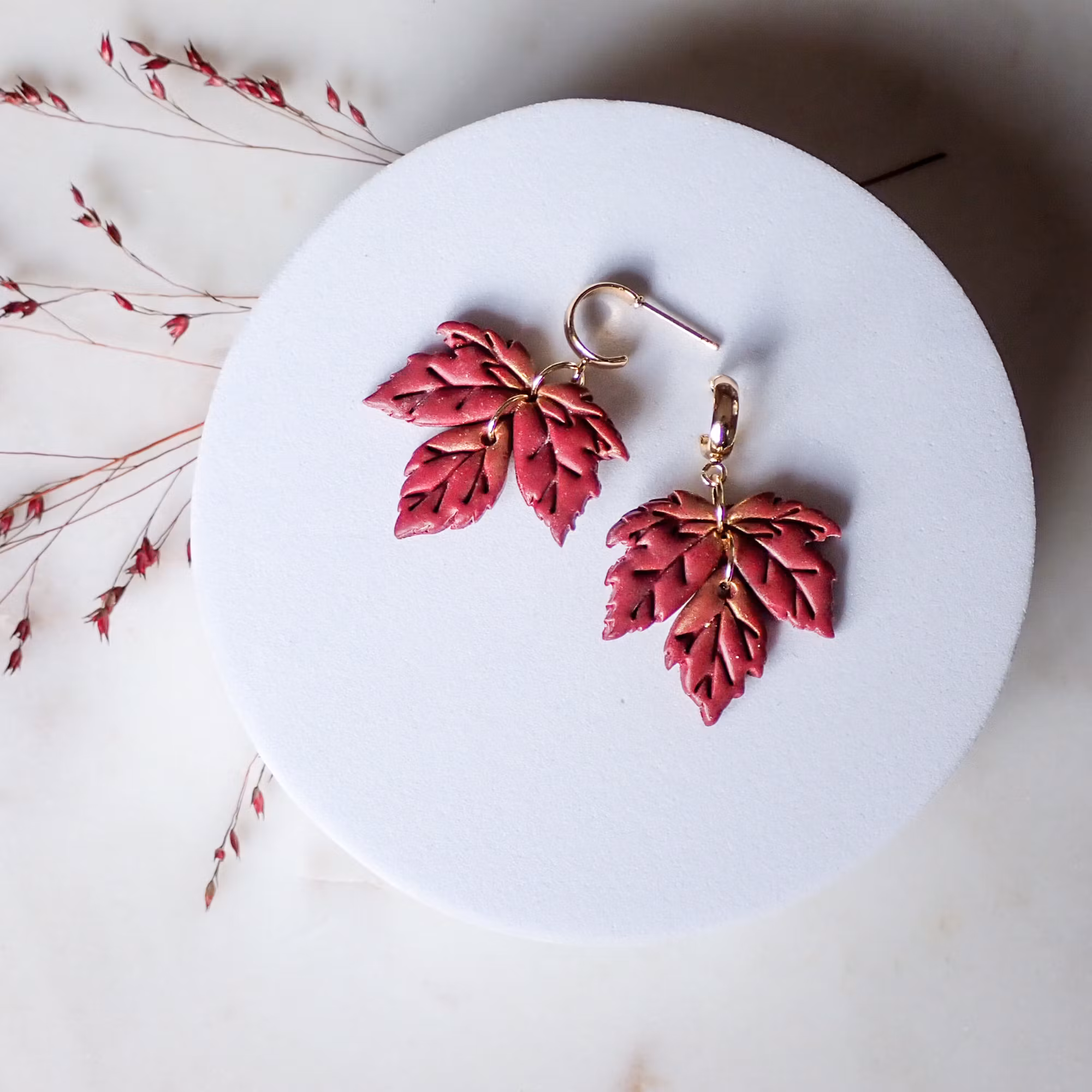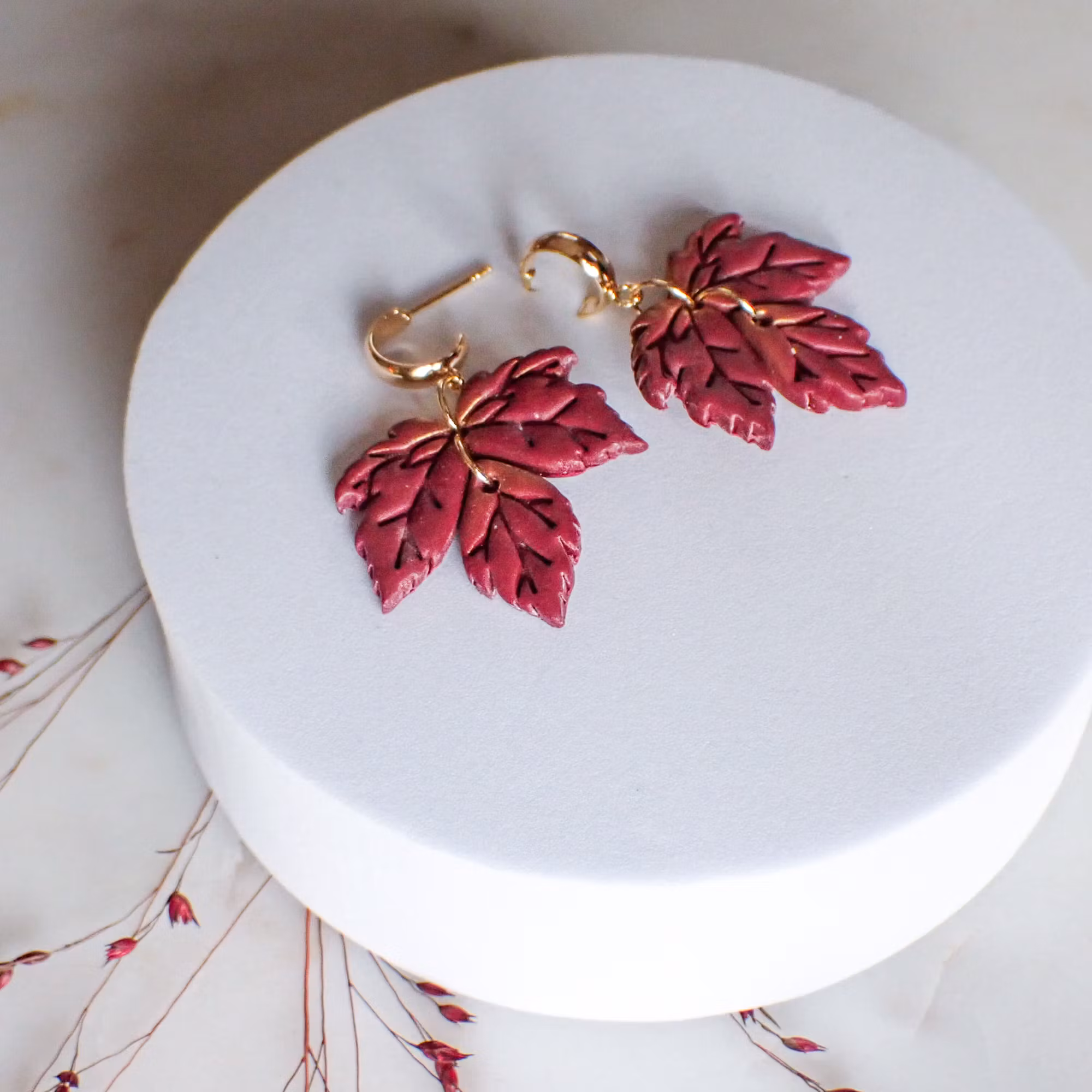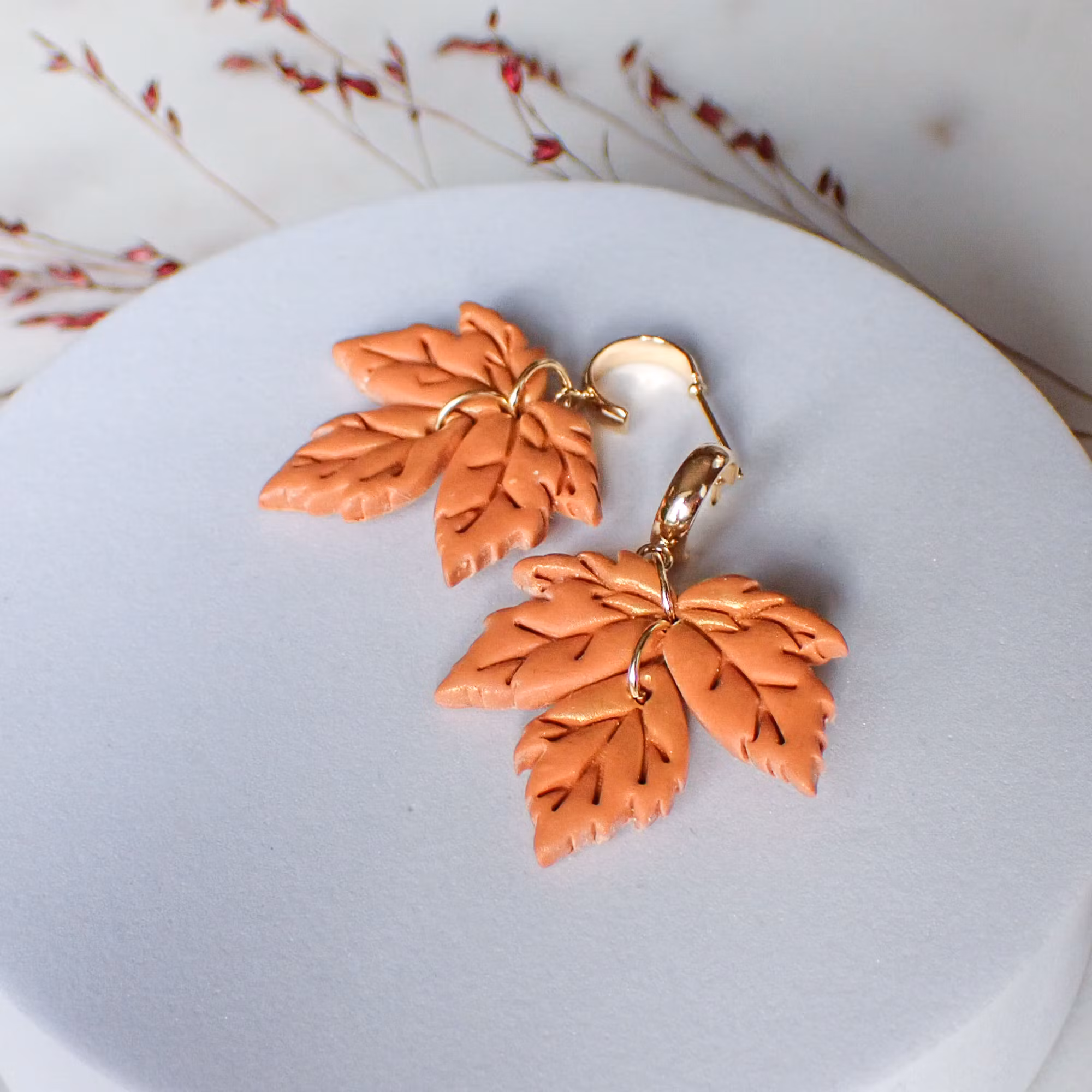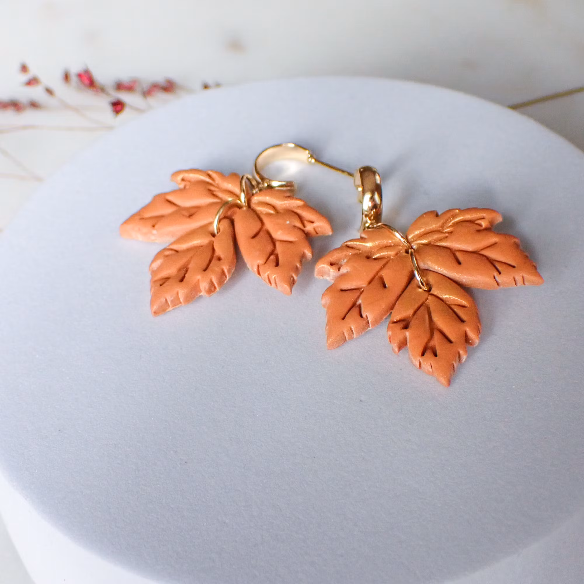 Tvådelade lövörhängen med mjuka former och guldiga nyanser. Skulpterade i polymerlera med lätt struktur som fångar ljuset fint. Lätta att bära och passar lika bra till vardag som till fest.