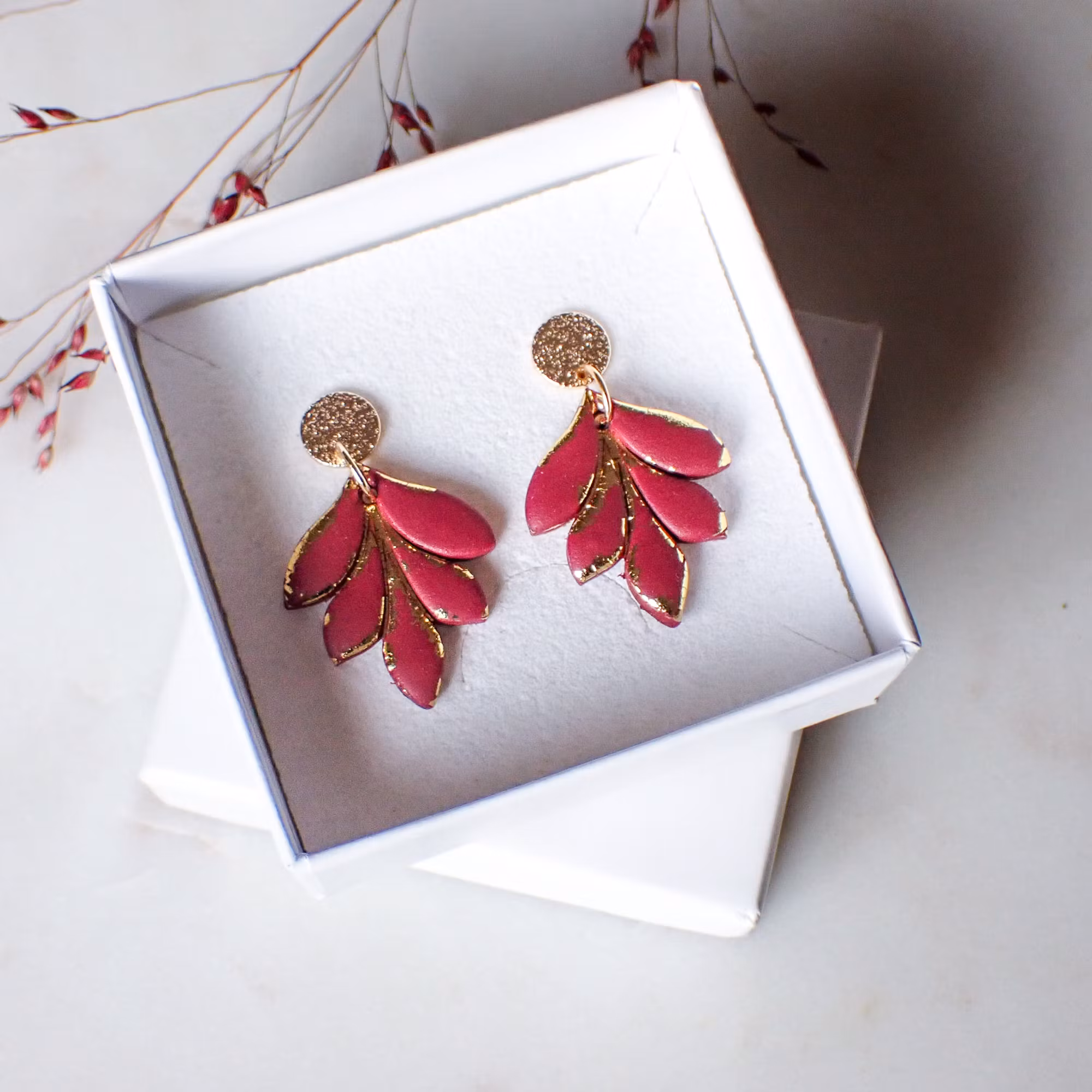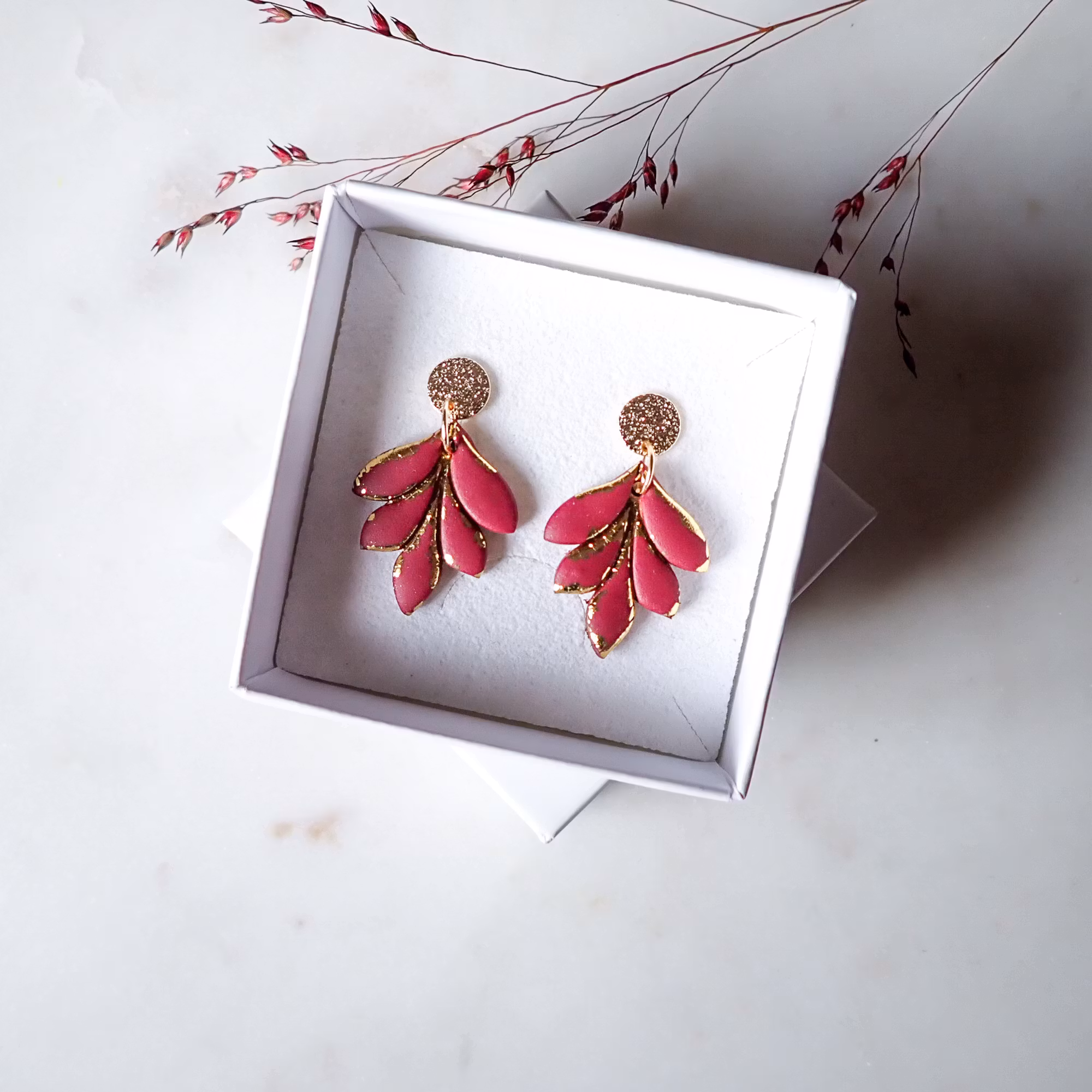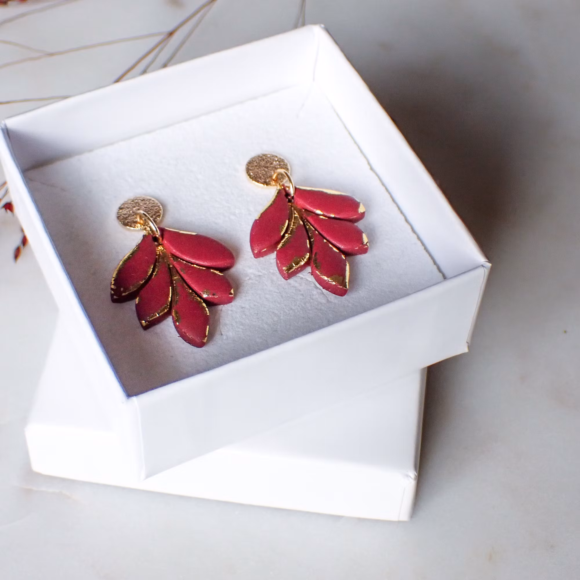 Örhängen i djup plommonfärg med guldiga skiftningar. En enkel men elegant design som ger ett fint färglyft till höstens outfits. Passar lika bra till stickat som till klänning.