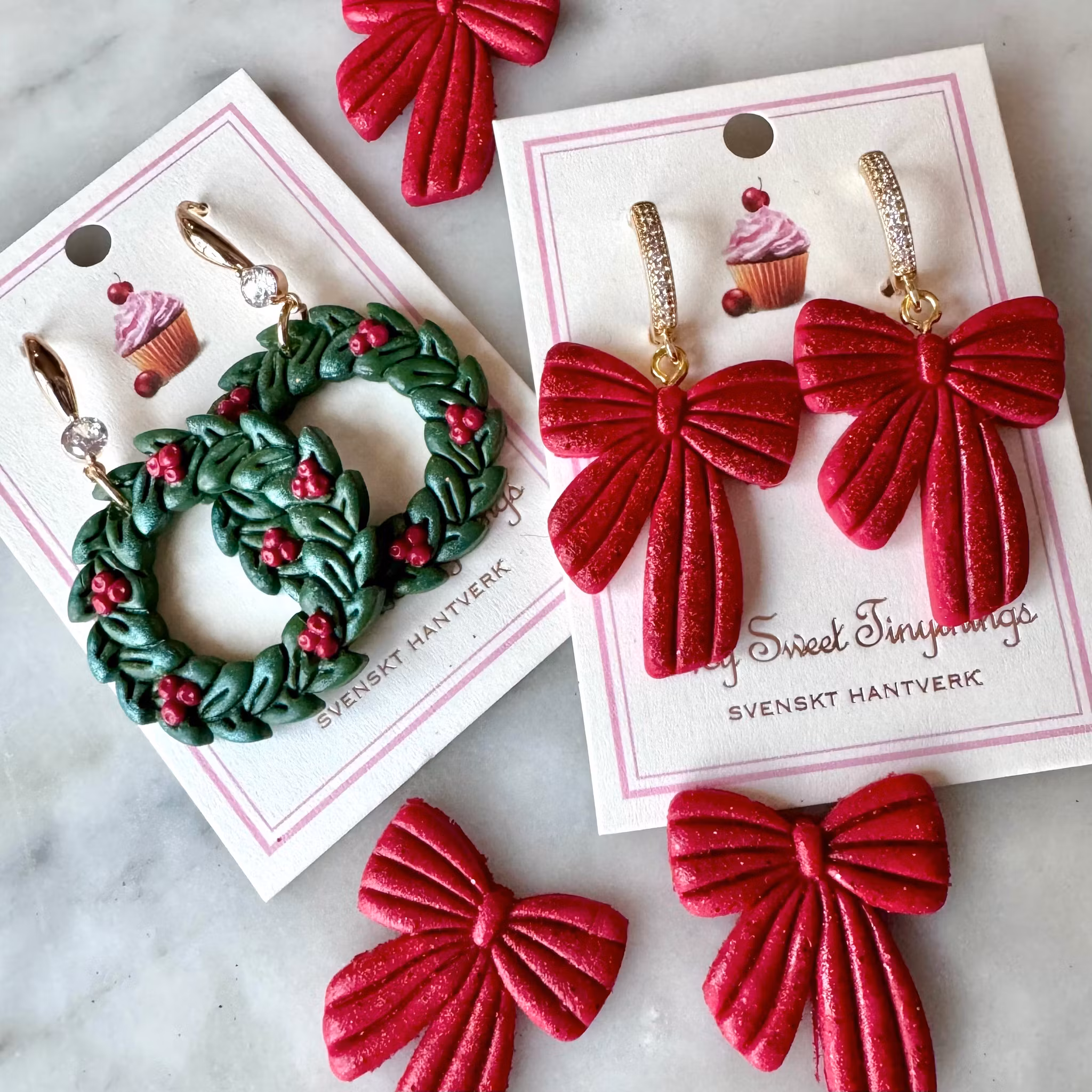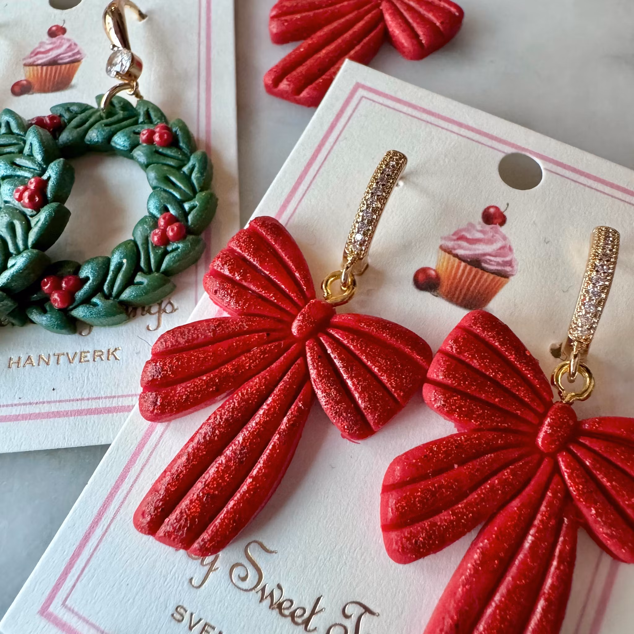Snygga rosettörhängen i rött som passar perfekt till julen men även är snygga längre fram i vinter! Välj mellan guldpläterade creoler med små kristaller eller klassiska franska öronkrokar i sterlingsilver.