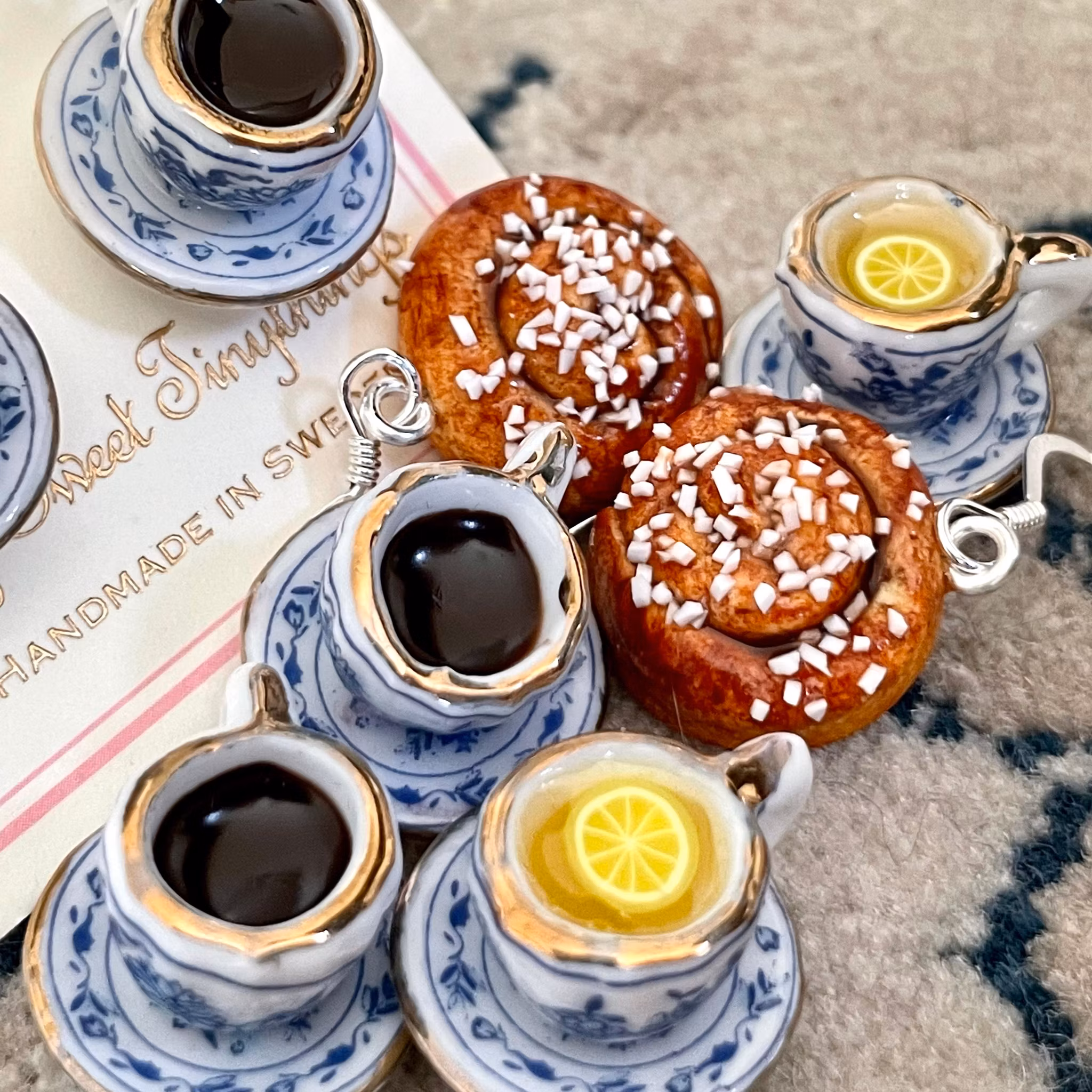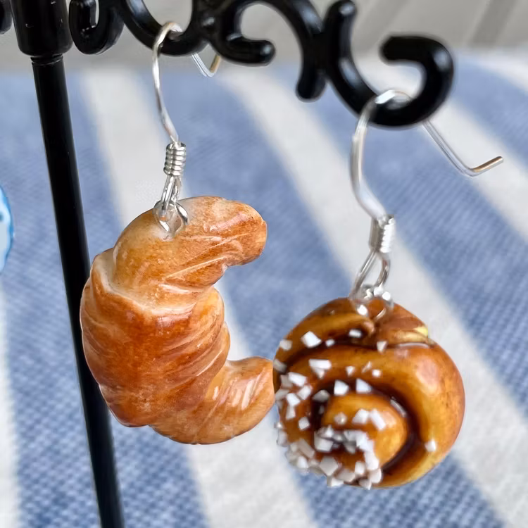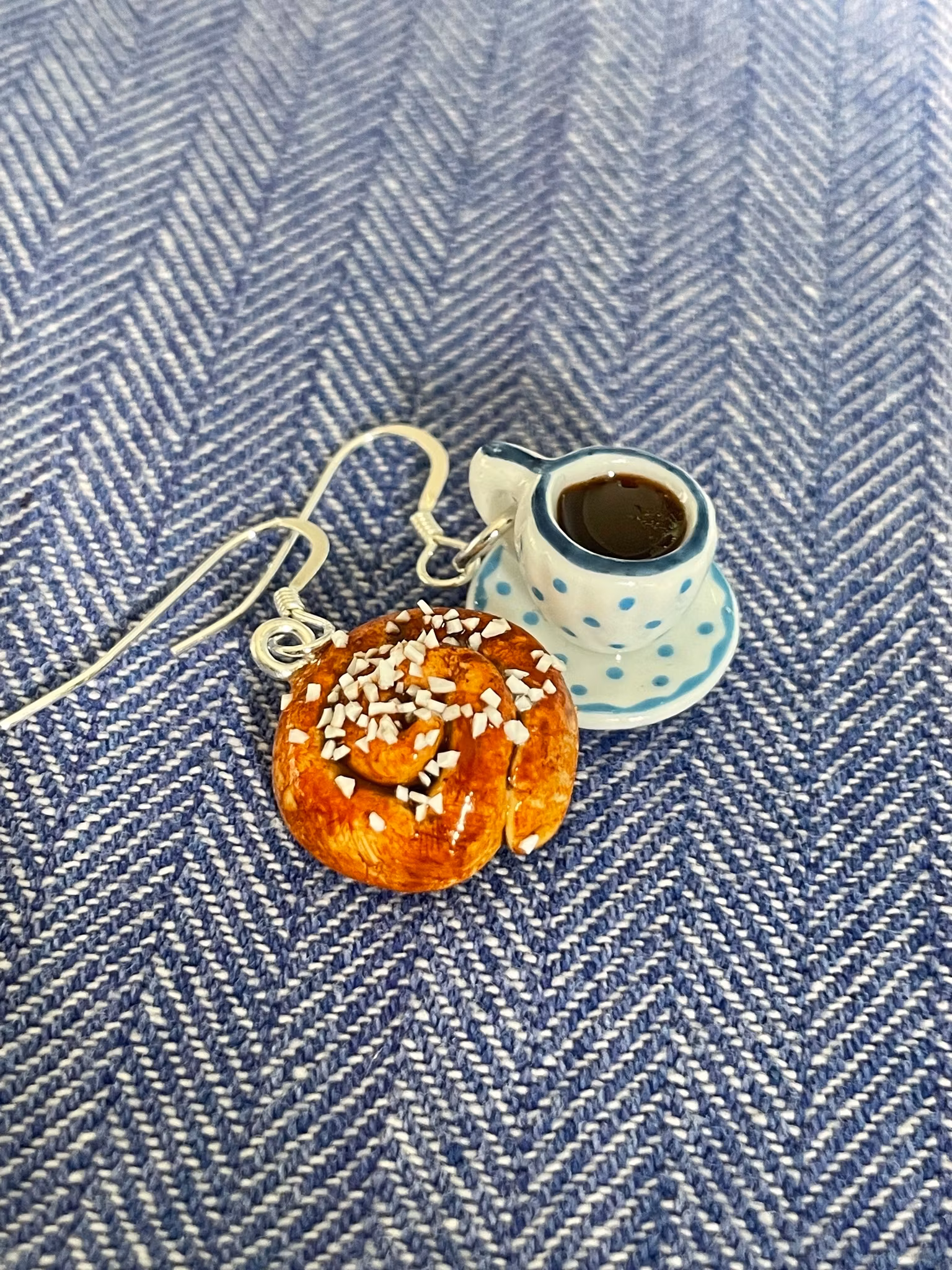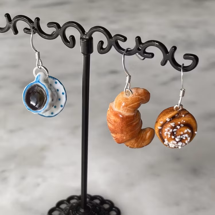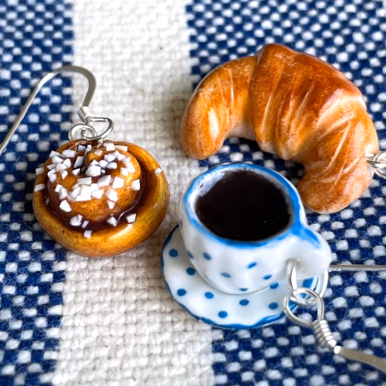 Supersöt prickig kaffekopp på fat med croissant eller kanelbulle - vilken väljer du?