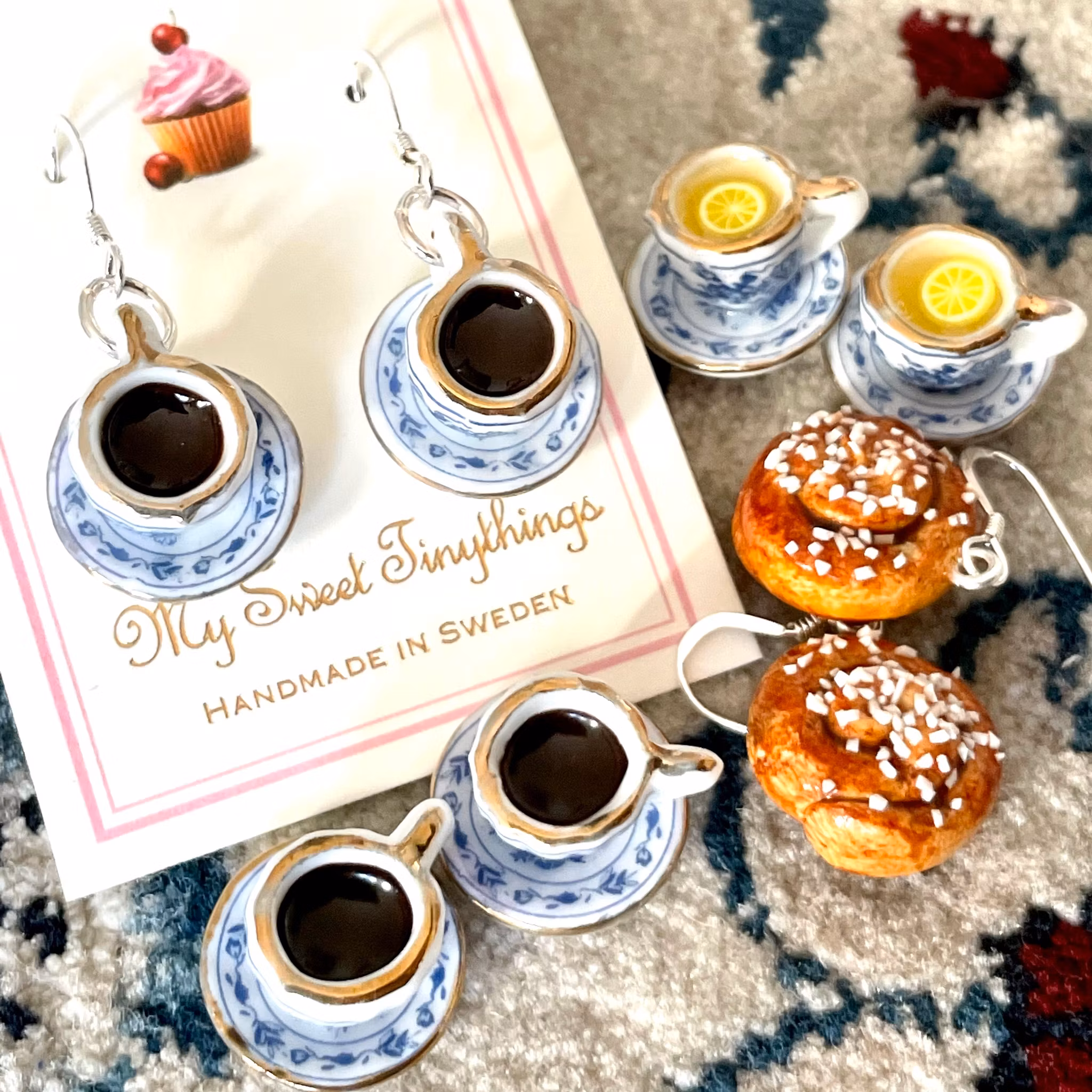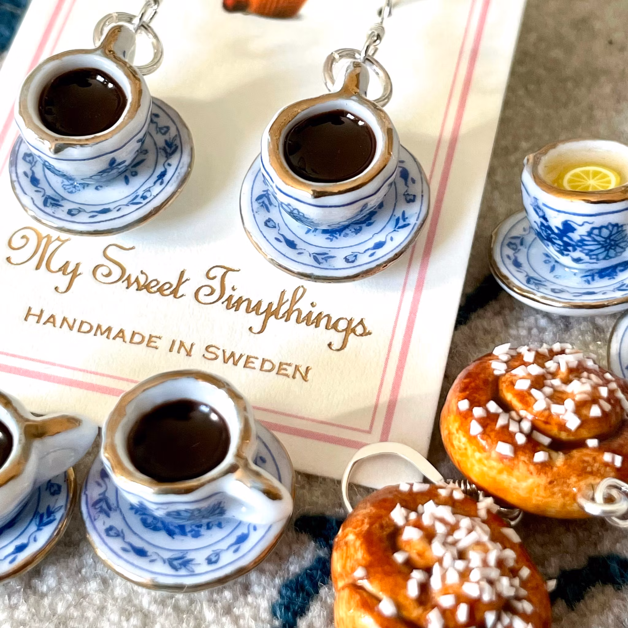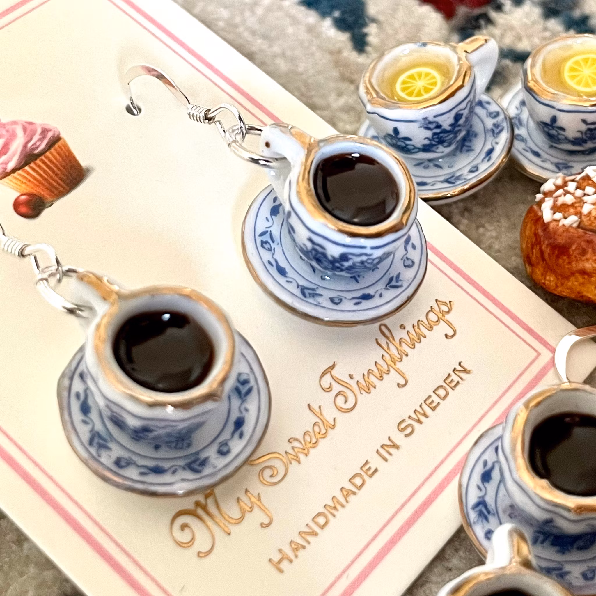 Underbara kaffekoppar i miniatyr med gulddetaljer. Finns både med krokar i sterlingsilver 925 och med guldpläterade krokar i 18 karat guld (basmetallen är i äkta silver). Välj variant när du beställer.