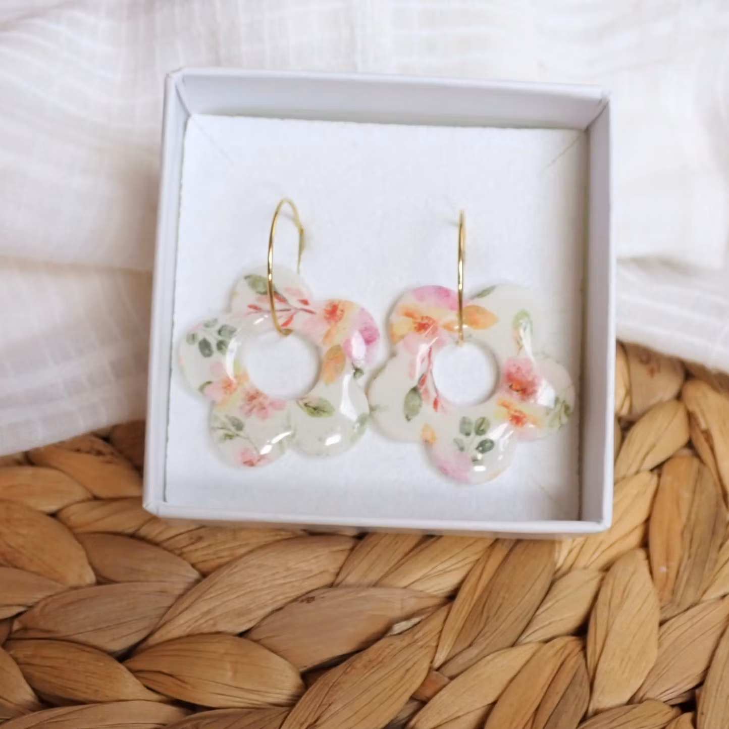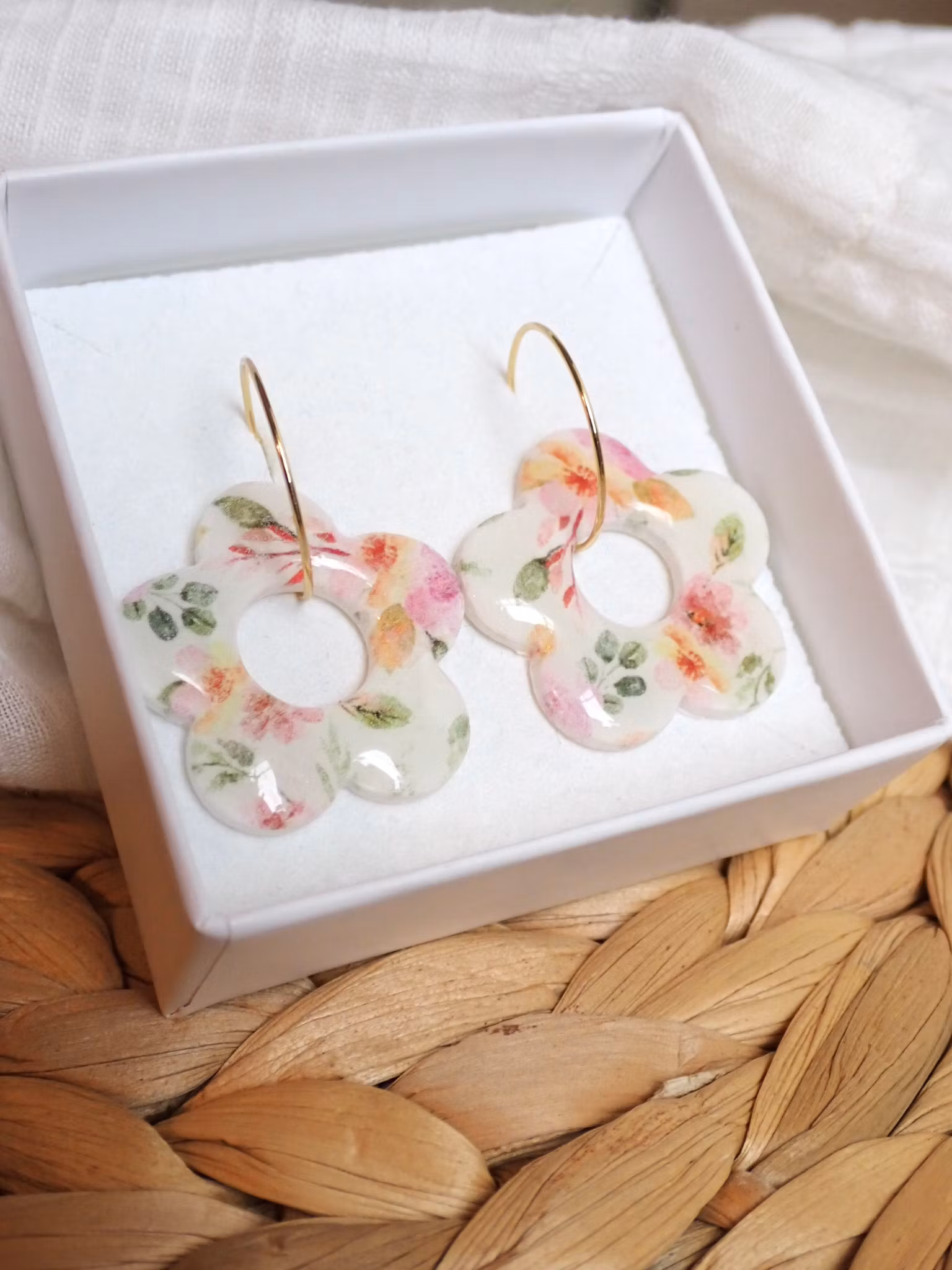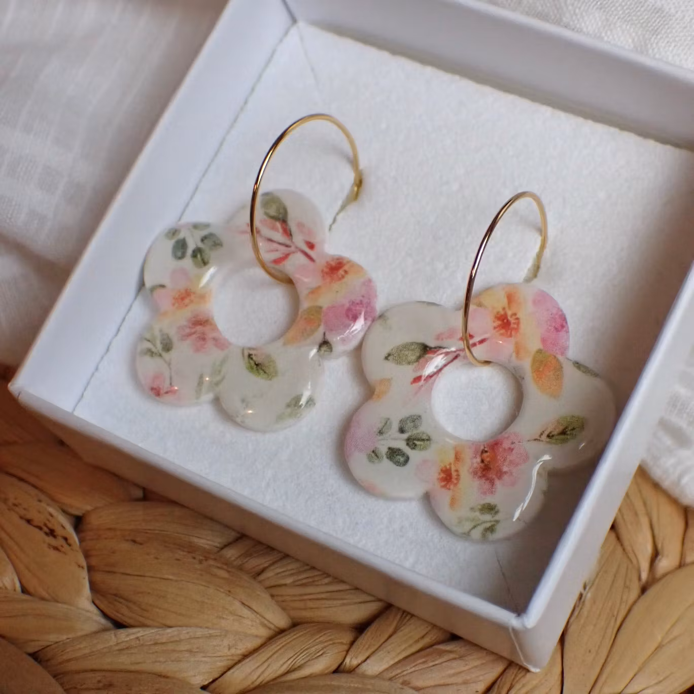 Handgjorda örhängen i blomform – skapade med en teknik där färg och mönster påminner om akvarellmålade blomblad, men allt är varsamt format i polymerlera. Nomi andas vårkänsla och lekfull romantik, med vackert ljusgenomsläpp och en silkeslen finish.