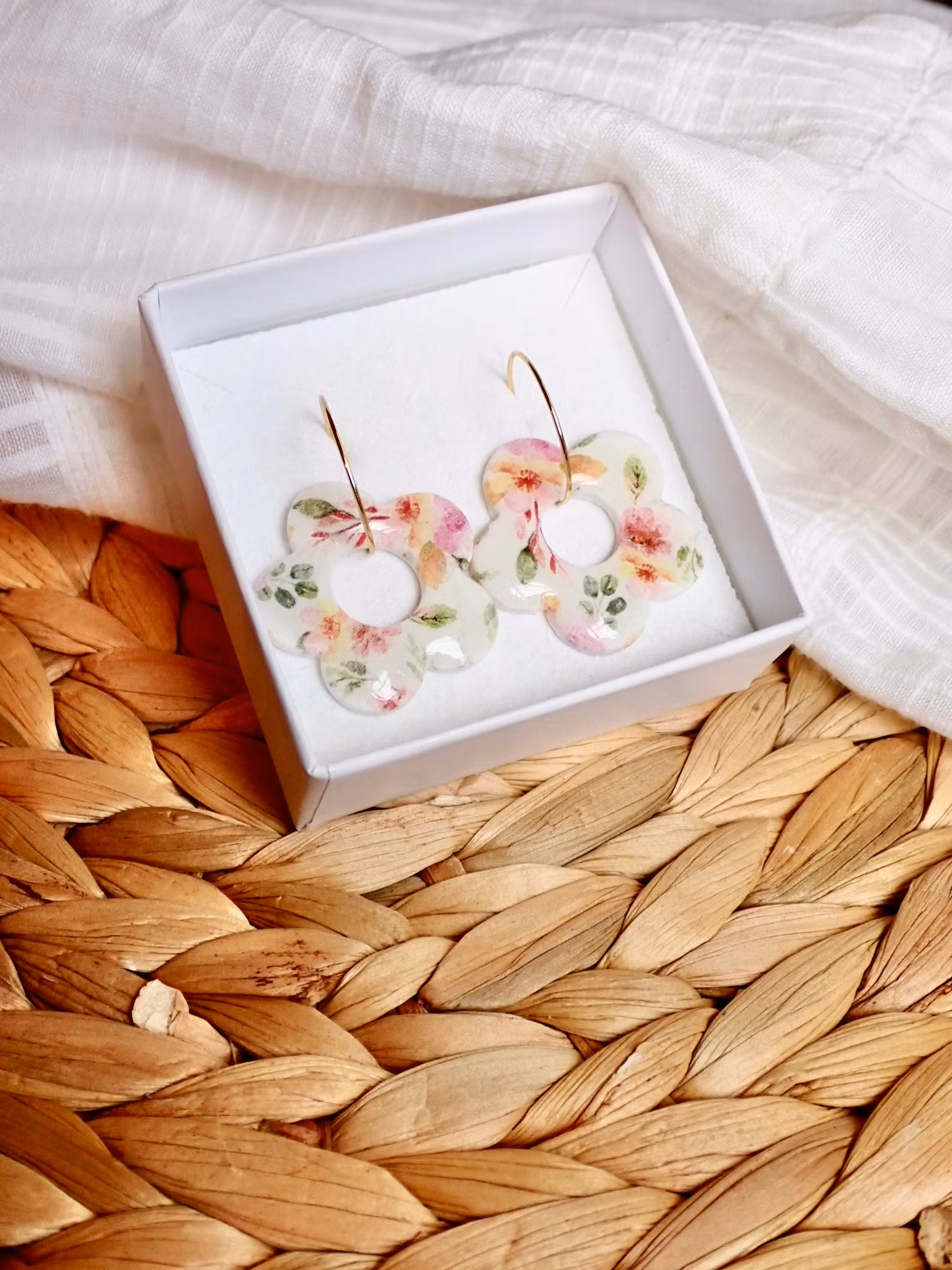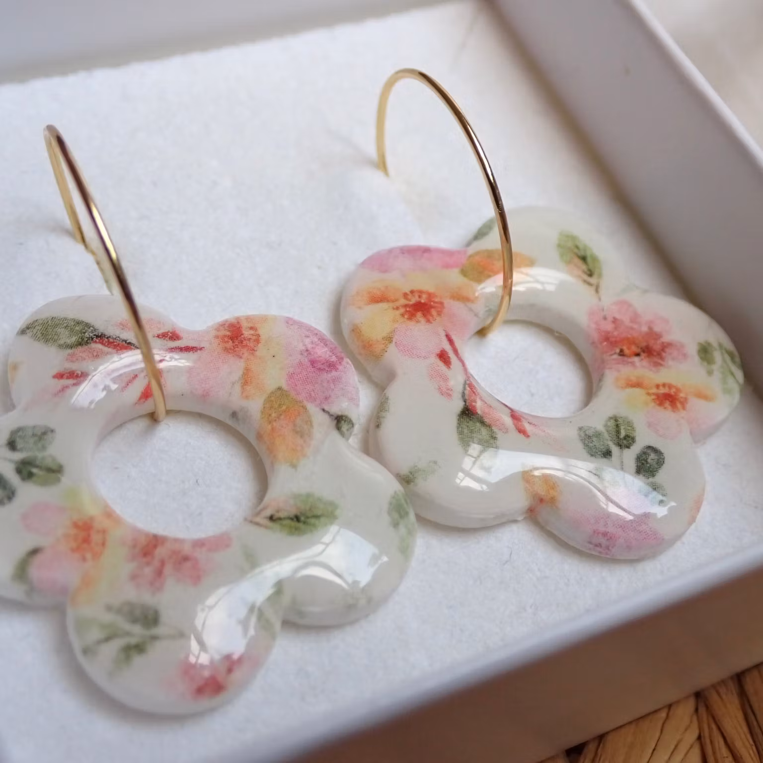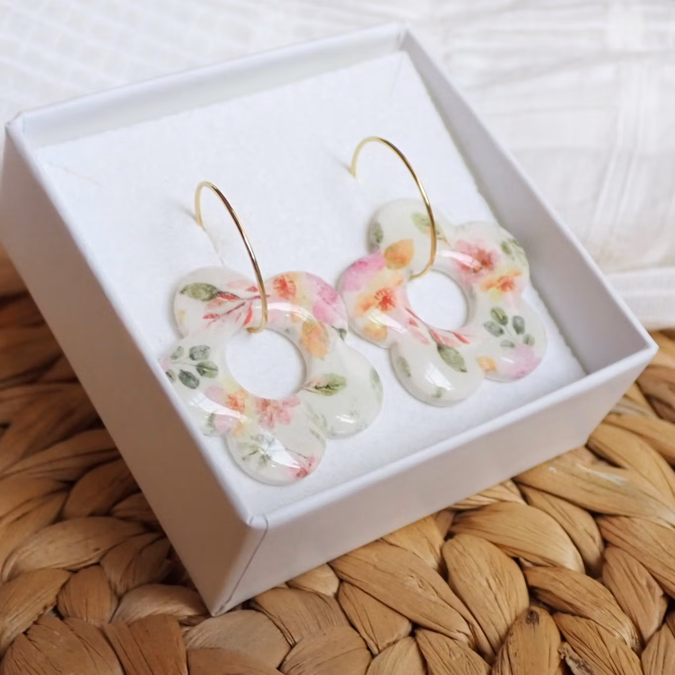 Handgjorda örhängen i blomform – skapade med en teknik där färg och mönster påminner om akvarellmålade blomblad, men allt är varsamt format i polymerlera. Nomi andas vårkänsla och lekfull romantik, med vackert ljusgenomsläpp och en silkeslen finish.