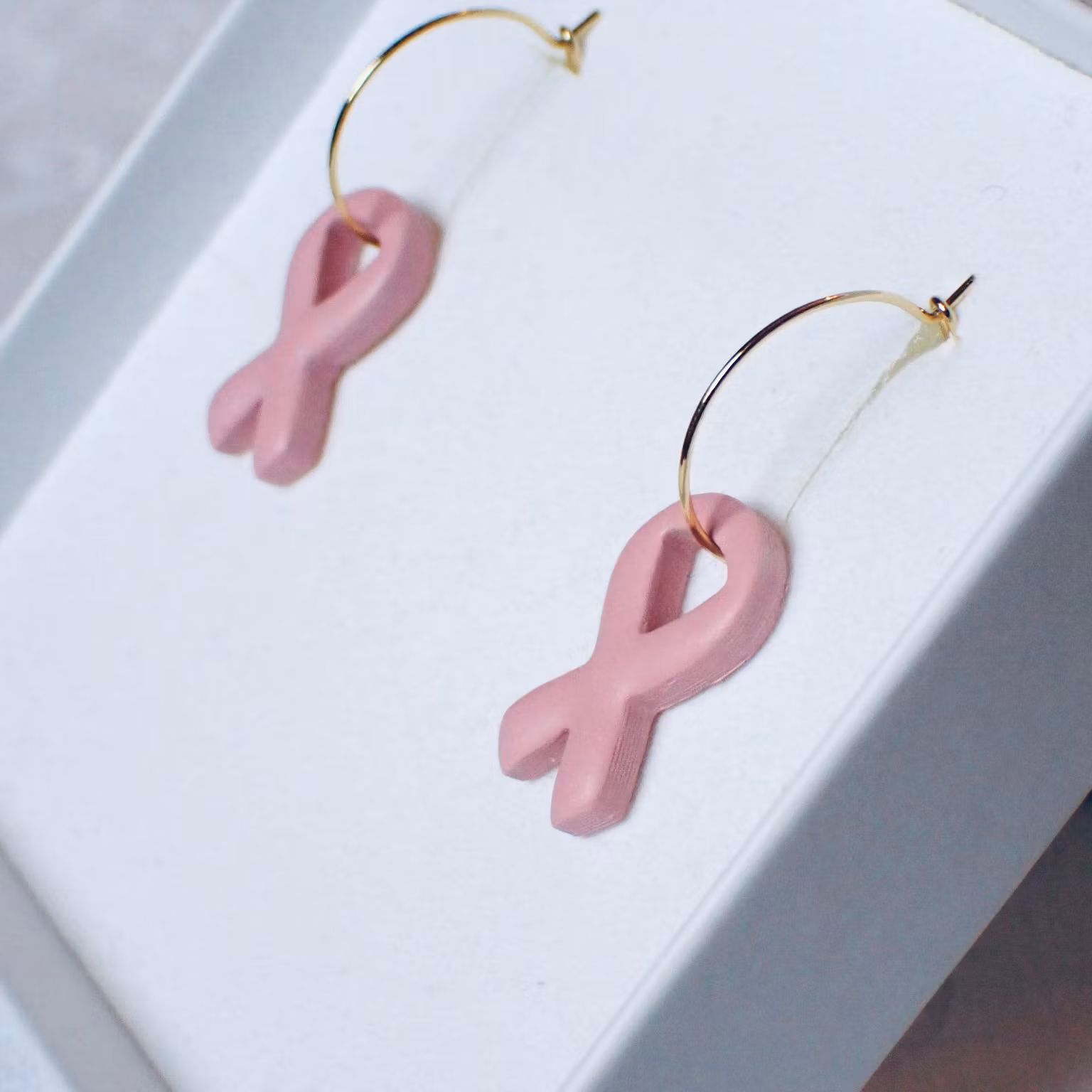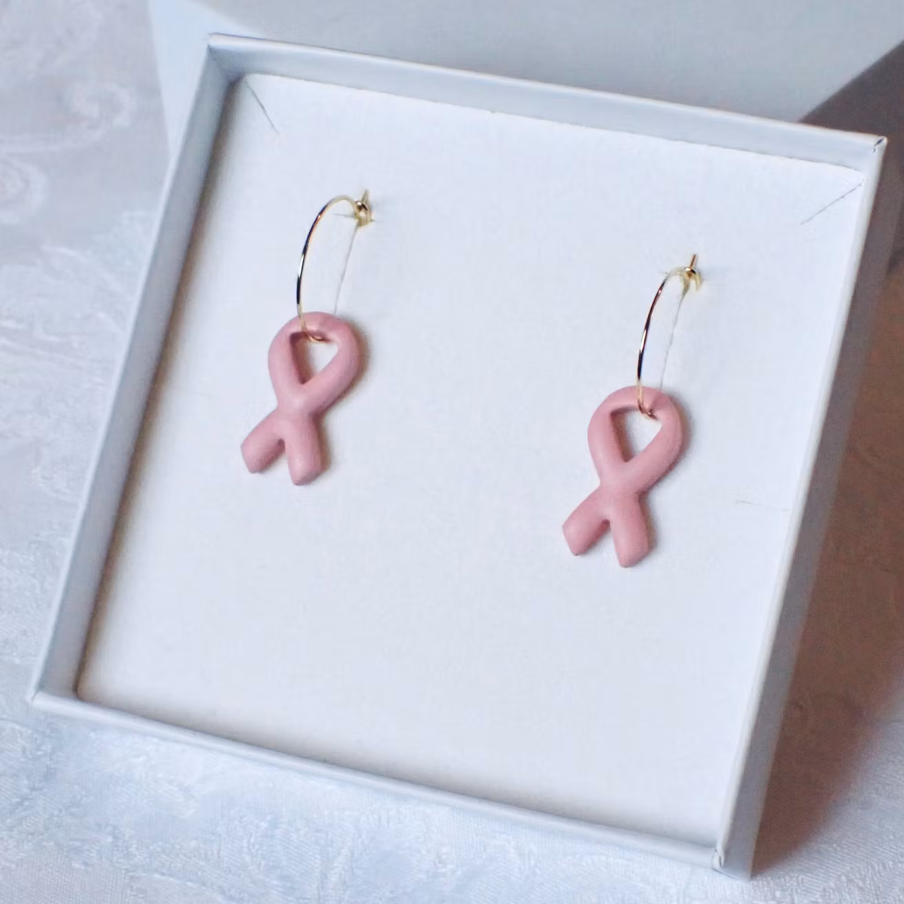 Ett rosa band i elegant design, fäst på guldpläterad hoop, skapat som en symbol för omtanke, styrka och gemenskap.